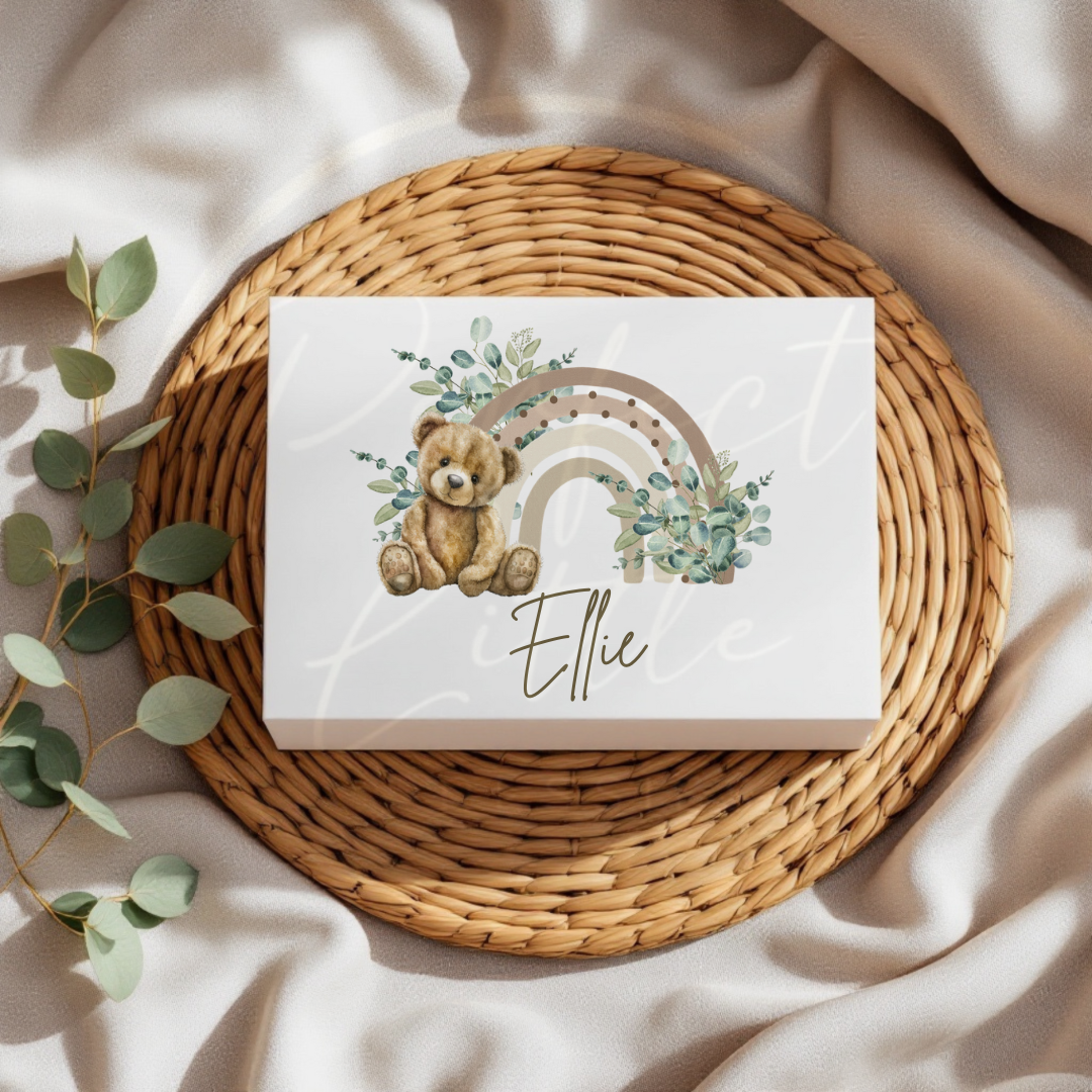 Celebrate life’s most precious moments with this charming personalised keepsake box, featuring a gentle beige bear and soft rainbow design – perfect for neutral nurseries and timeless baby gifts.