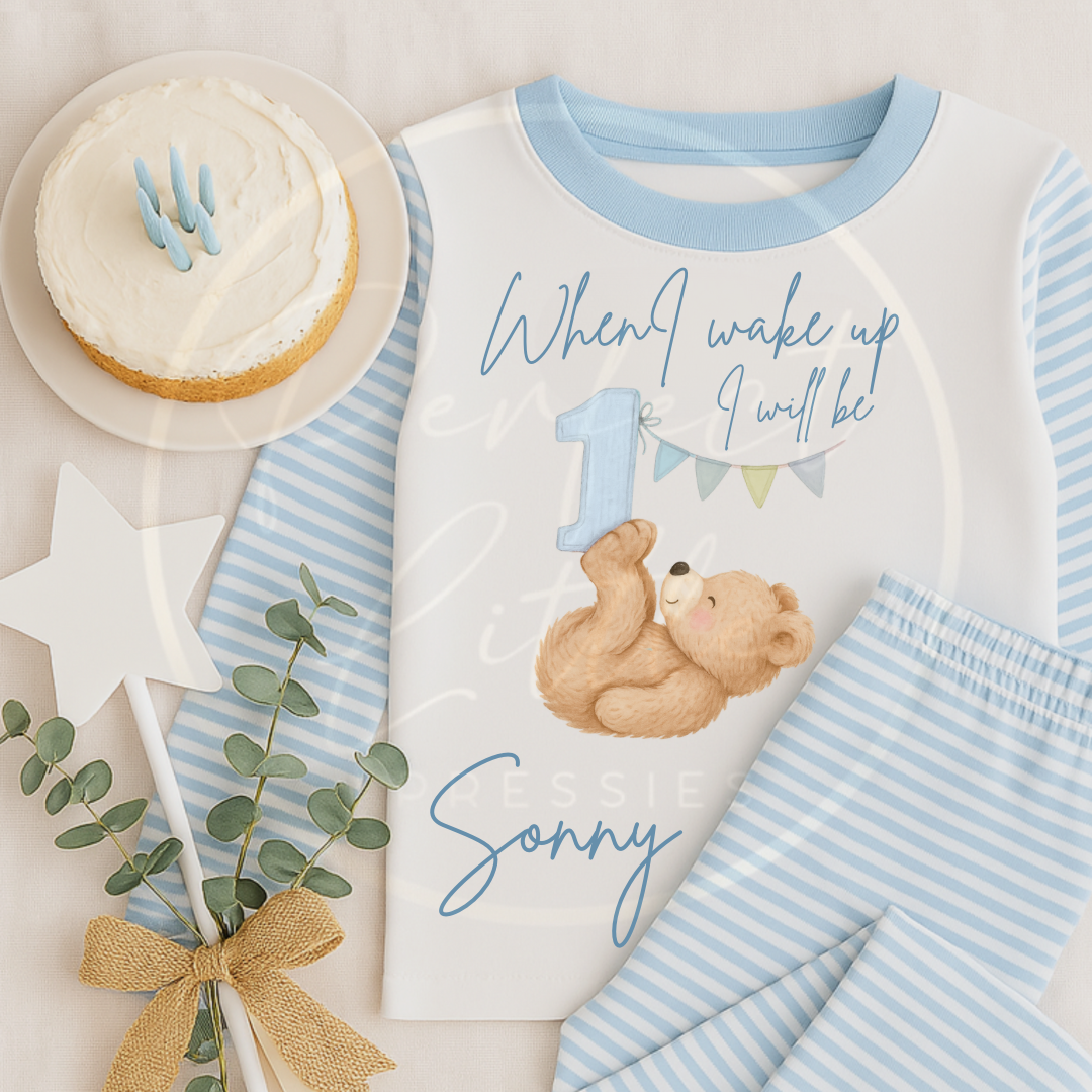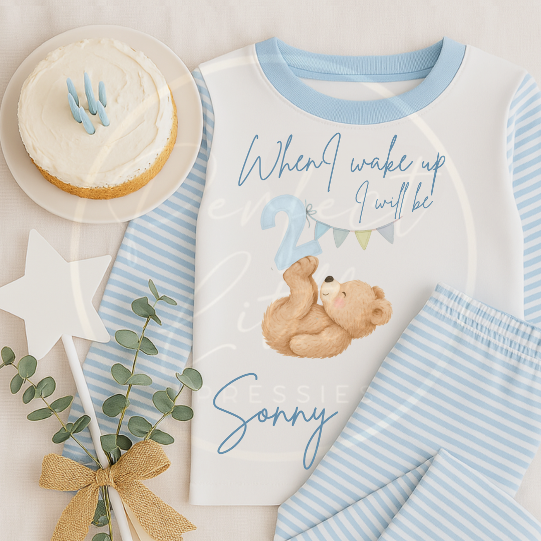 Celebrate your little one’s special milestone in style with our adorable Personalised Blue Bear Pyjamas. Featuring a cute bear illustration alongside a number of your choice (1, 2, or 3), these comfy pyjamas are perfect for birthday snuggles or making memories at bedtime.