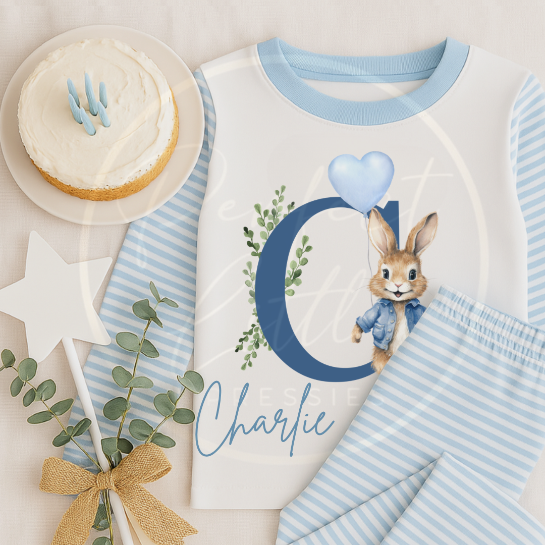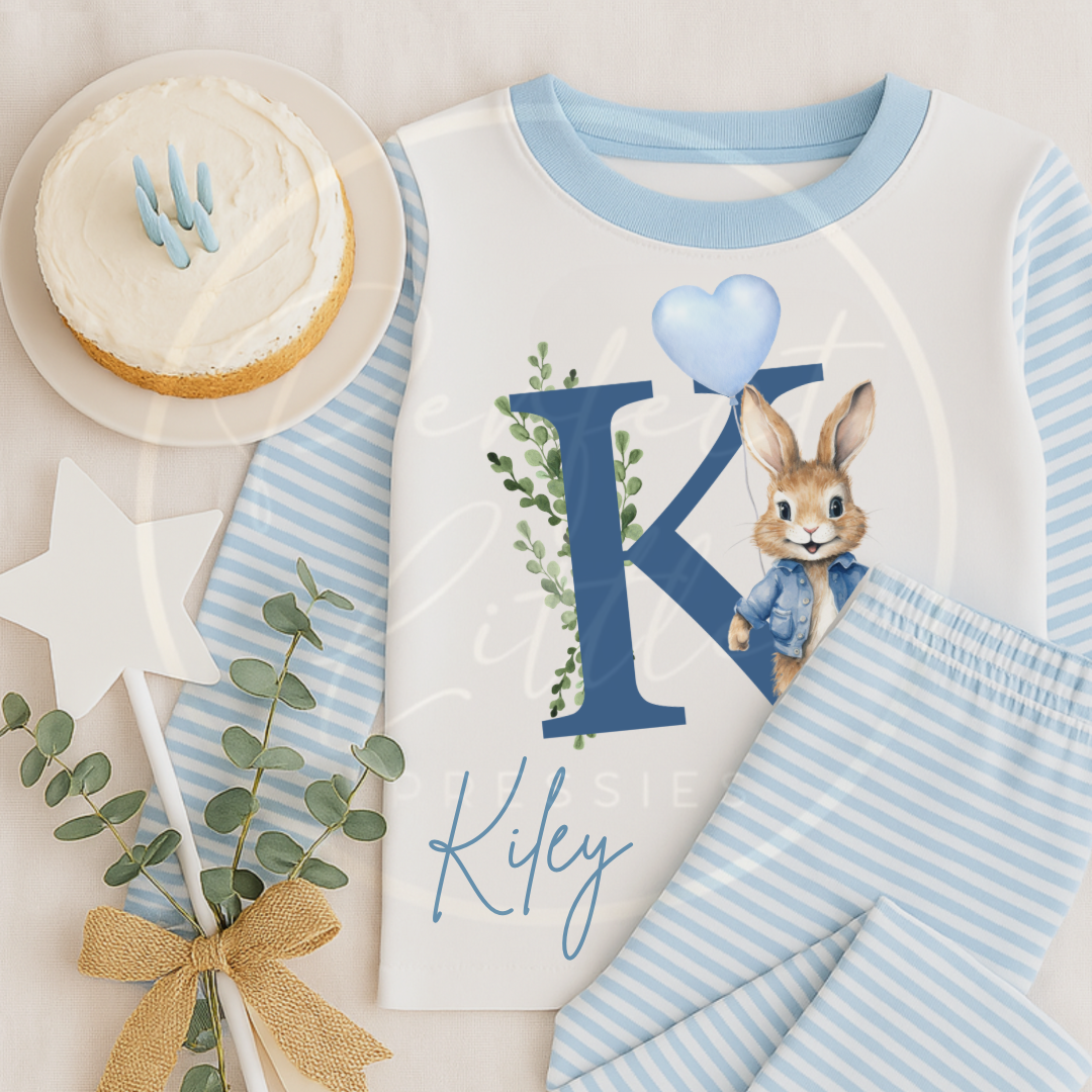 Personalised Kids' Blue Bunny Pyjamas – Custom Initial & Name Design