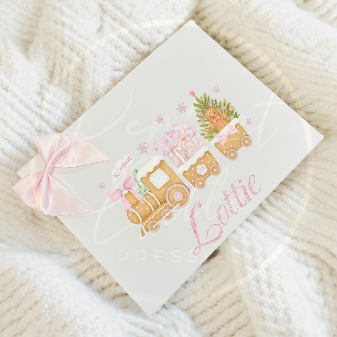 🍬🚂🎀 Personalised Christmas Box – 1st Christmas Pink Gingerbread Train Design 🎄✨