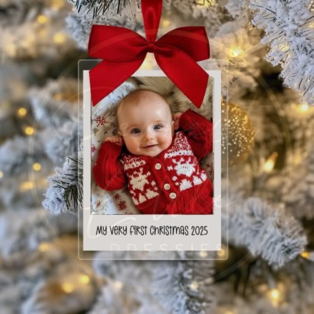 Capture a special memory this festive season with this beautiful personalised acrylic Christmas decoration featuring your own Polaroid-style photo and custom text. Perfect for cherishing loved ones, marking milestones, or celebrating family moments, this decoration adds a truly personal touch to your tree.