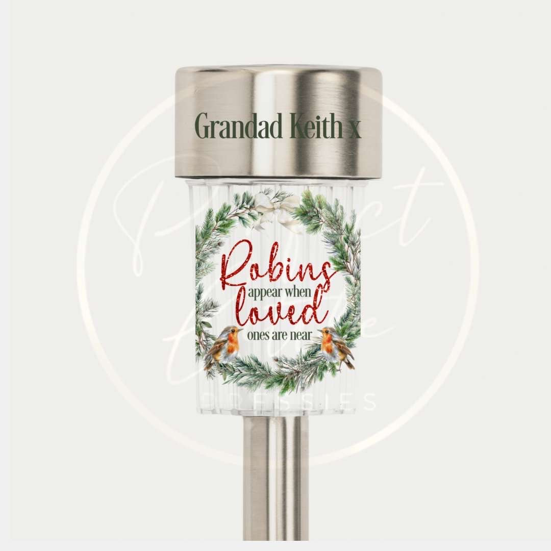 Bring light and love to your garden with this beautiful memorial solar light on a stake, featuring the heartfelt phrase “Robins appear when loved ones are near.” This touching design serves as a gentle reminder that those we love are always with us, even when they’re not by our side.