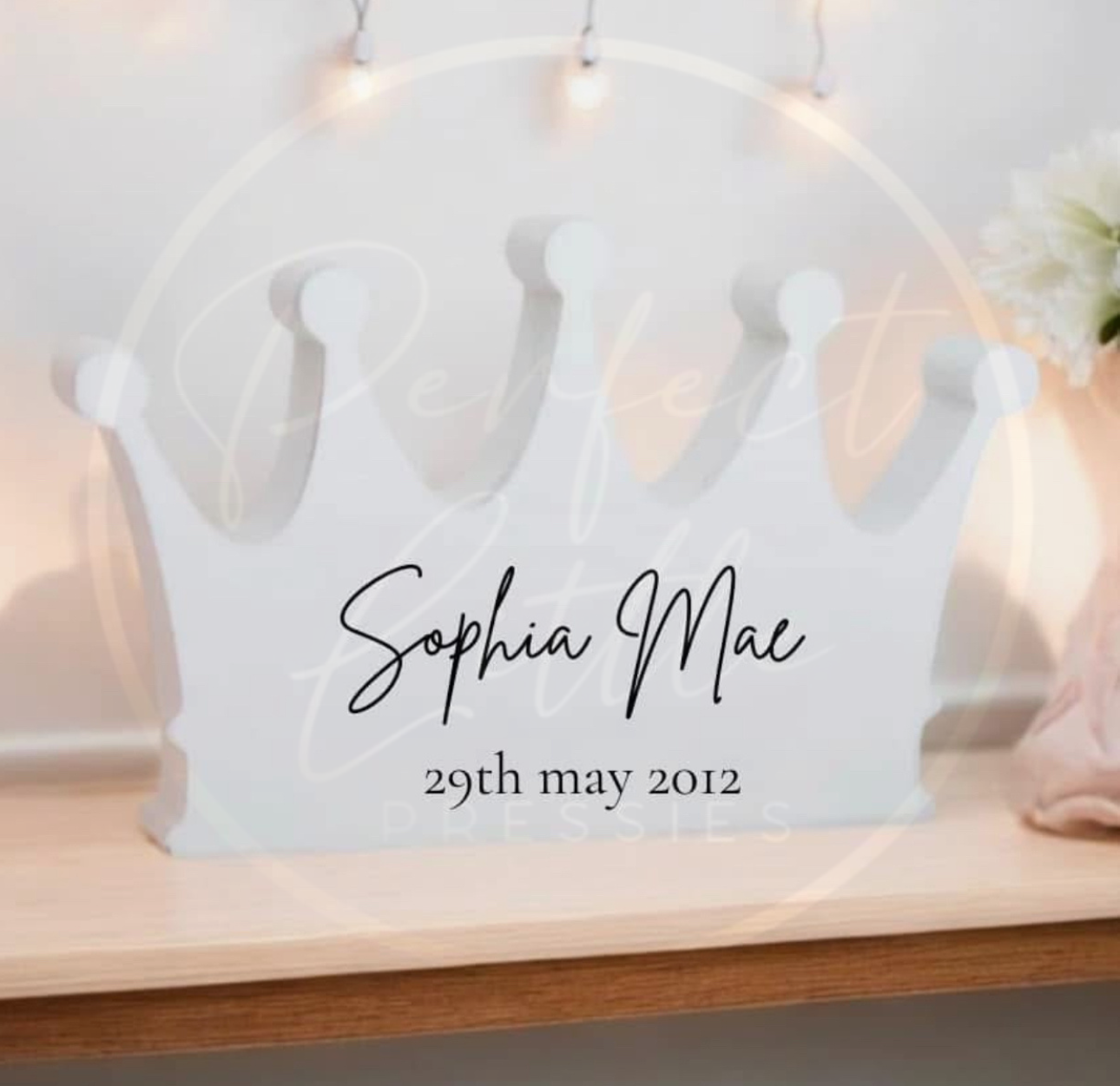Add a royal touch to any space with this charming freestanding crown decoration, beautifully crafted and custom-made just for you. Whether you're celebrating a birthday, decorating a nursery, or looking for a unique gift, this personalised crown is the perfect centrepiece.