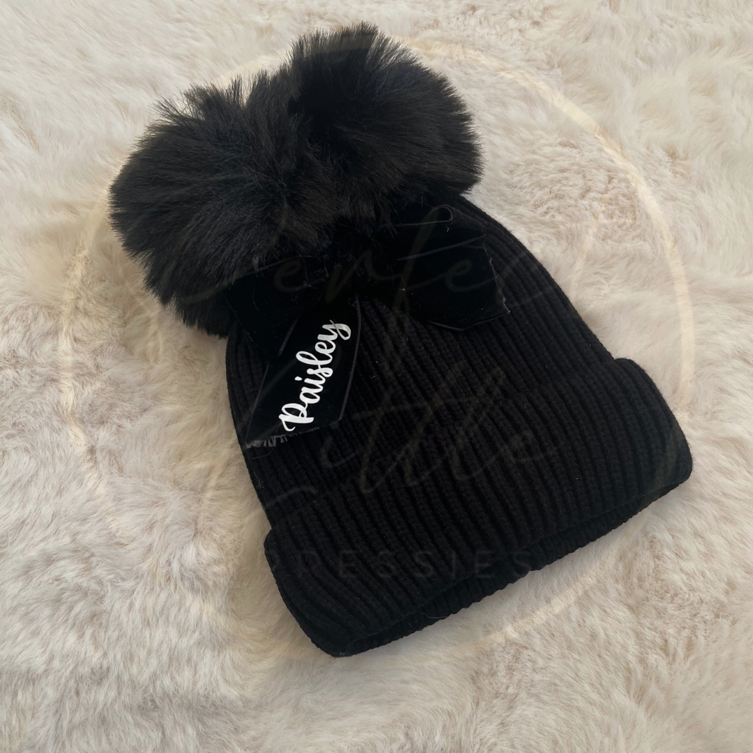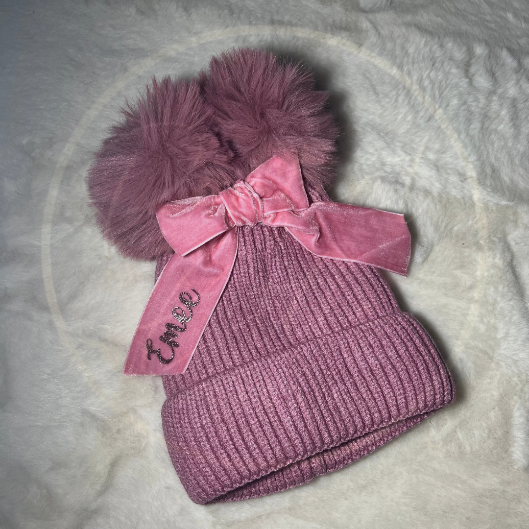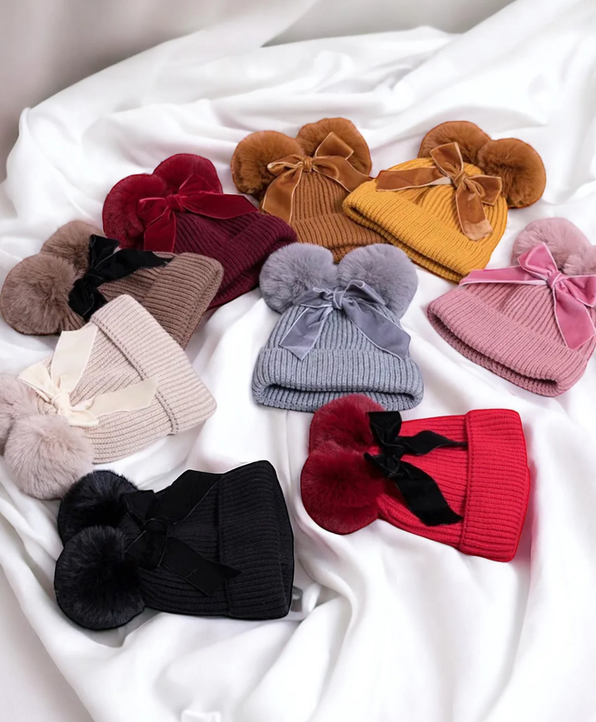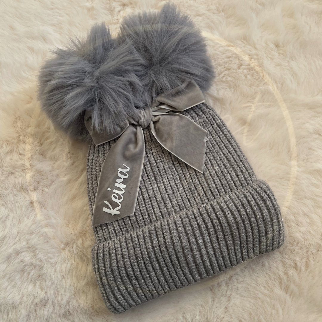 Keep cozy in style with our adorable Double Pom Pom Knitted Bow Hat, featuring a personalised touch!