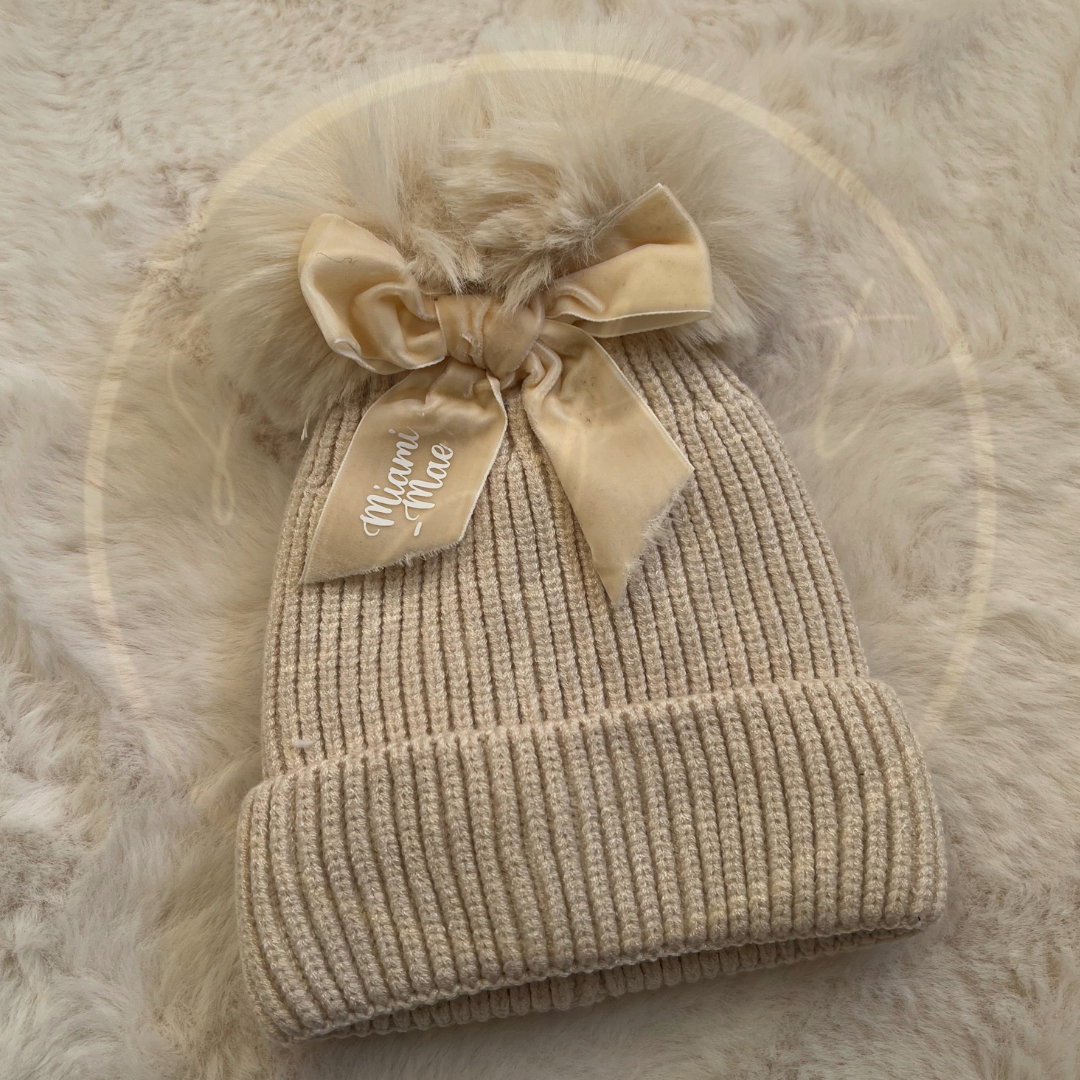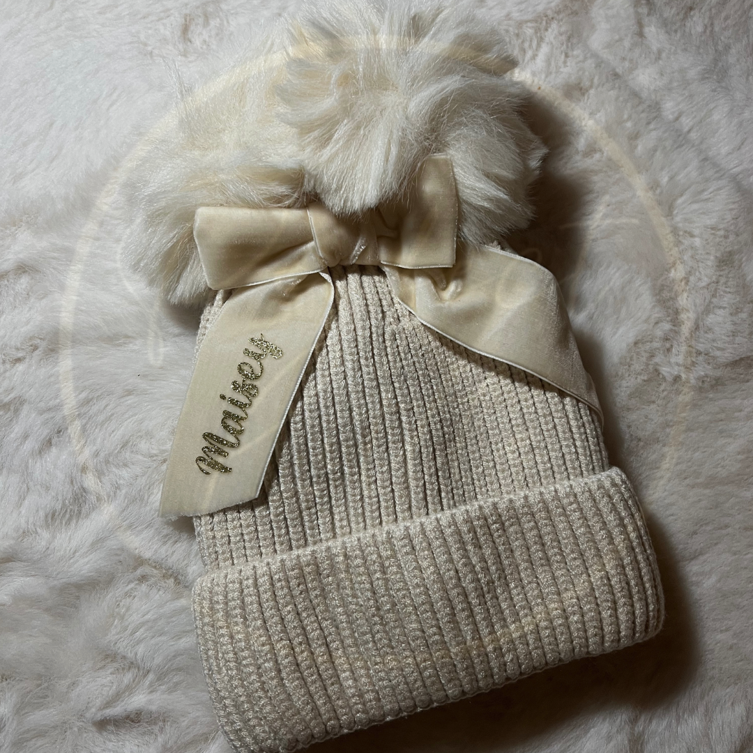 Crafted from soft, high-quality yarn, this snug beanie boasts two fluffy pom poms for a playful, standout look. The star of the show is the beautifully knitted bow on the front, which can be personalised with your chosen name, initials, or word — making it a perfect gift or a unique addition to your winter wardrobe.
