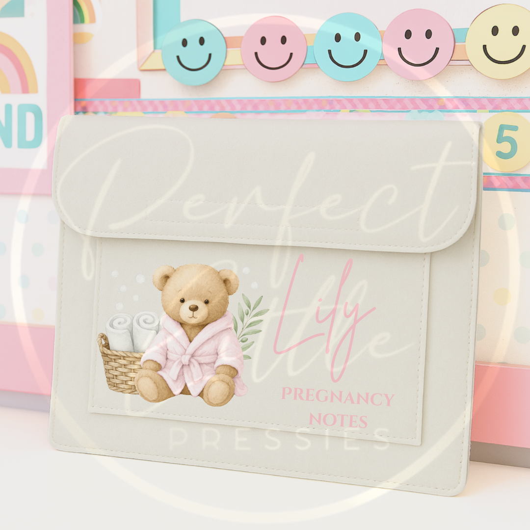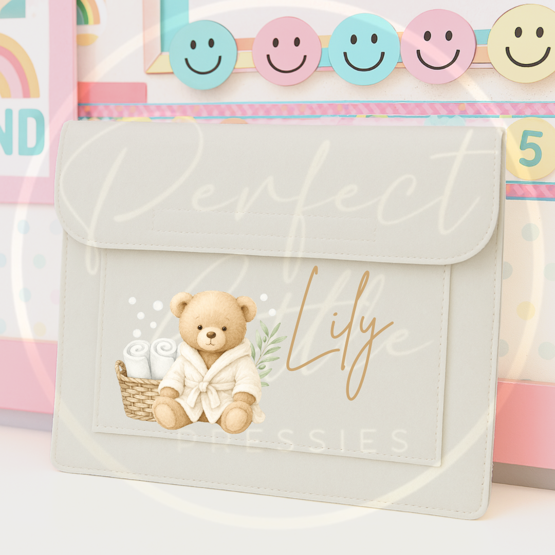 The folder is made from high-quality felt and fastens securely, making it ideal for school, nursery, or home organisation. The sweet design of a cuddly teddy wrapped in a fluffy dressing gown adds a comforting feel, while your chosen name or message is expertly personalised on the front.