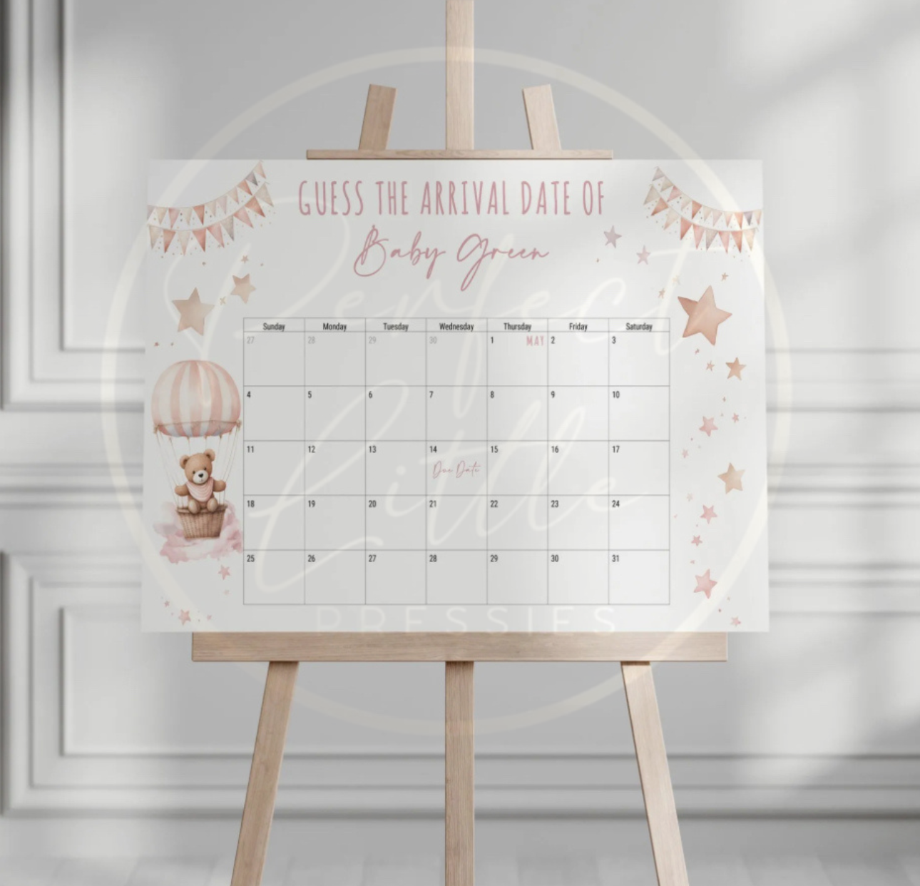 Add a fun and interactive touch to your baby shower with our Custom "Guess the Baby’s Birth Date" sign! Designed in a soft, neutral palette of pink, blue, natural, and grey, this sign perfectly complements any baby shower theme — whether you're keeping things classic, gender-neutral, or modern.
