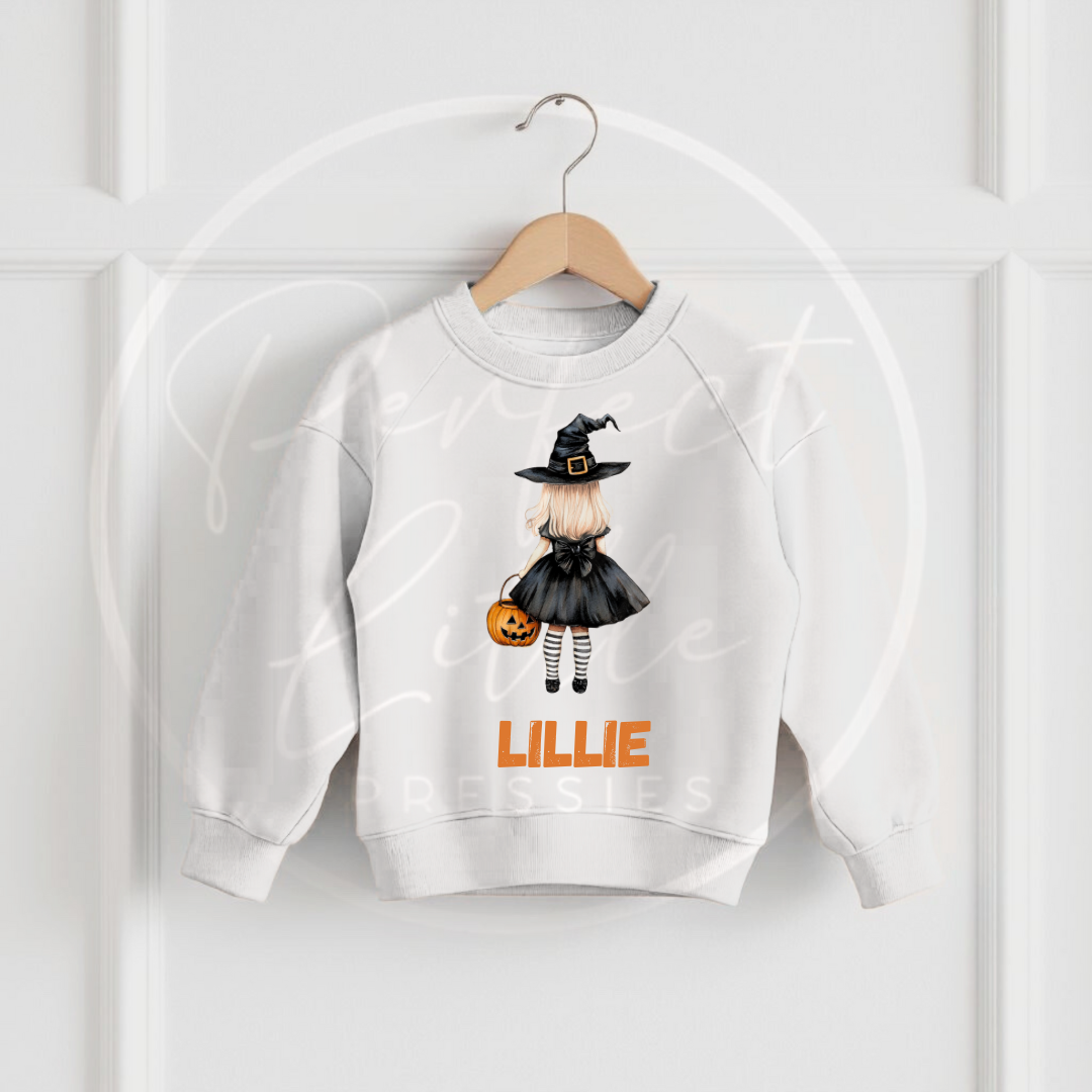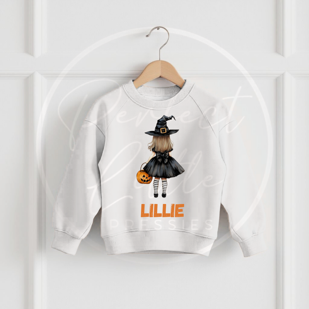 Let your little one cast some seriously cute spells this Halloween with our personalised Witch Dolly sweatshirt! This charming white sweatshirt features an adorable witch doll illustration, complete with a pointy hat and spooky-sweet details that are perfect for the season.