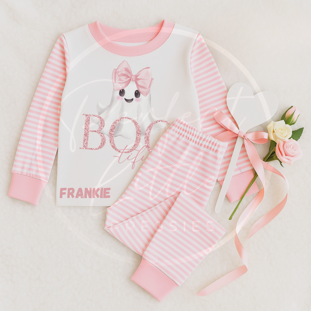 Stay cosy and cute this Halloween with our Personalised “Bootiful” Ghost Pyjamas! Featuring an adorable ghost design with the playful slogan “Bootiful”, these pink pyjamas are the perfect mix of spooky and sweet.