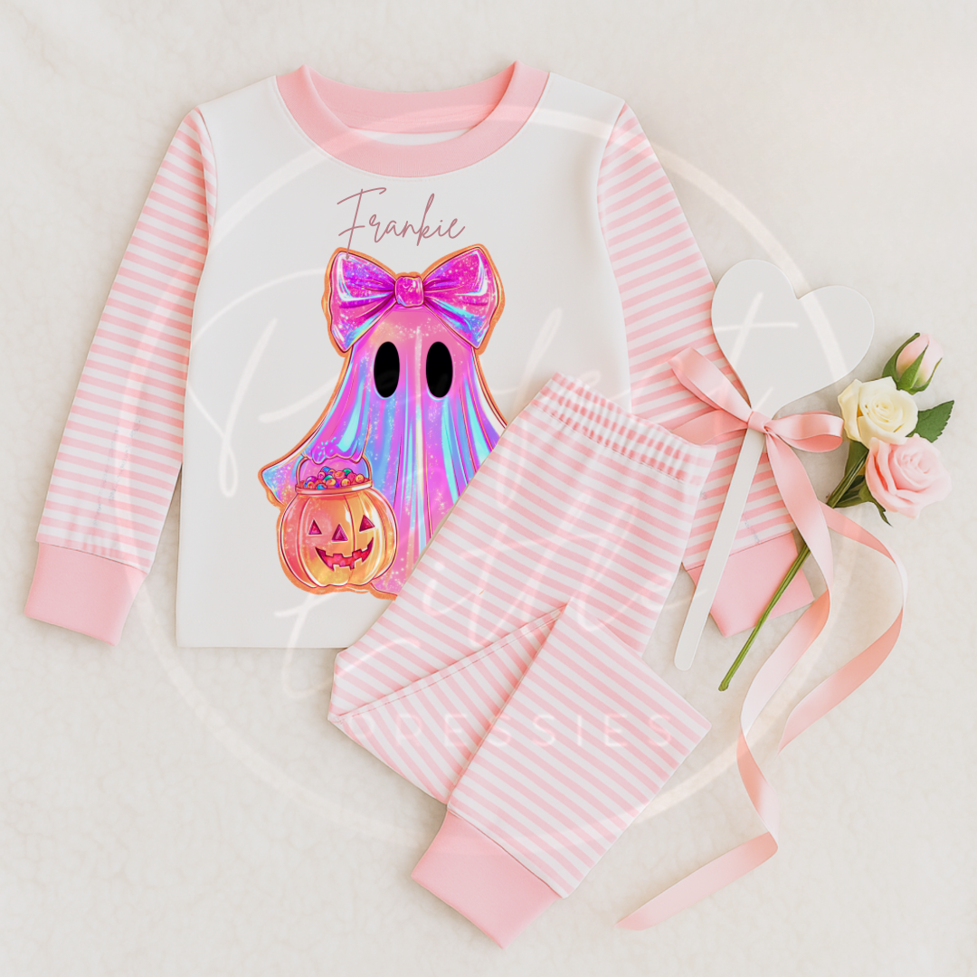 Drift off in spooky-cute style with our Personalised Iridescent Ghost Pyjamas! These cosy pink pyjamas feature a shimmering ghost design that catches the light with a magical iridescent finish – perfect for adding a playful glow to Halloween nights.