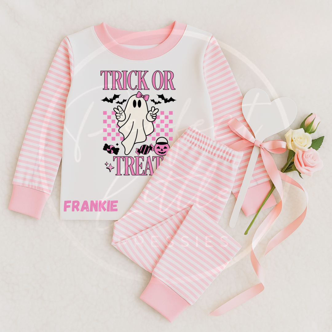 Get into the Halloween spirit with our Personalised “Trick or Treat” Ghost Pyjamas! These cosy pink pyjamas feature a playful ghost design carrying the classic “Trick or Treat” message – fun, festive, and perfect for the spooky season.