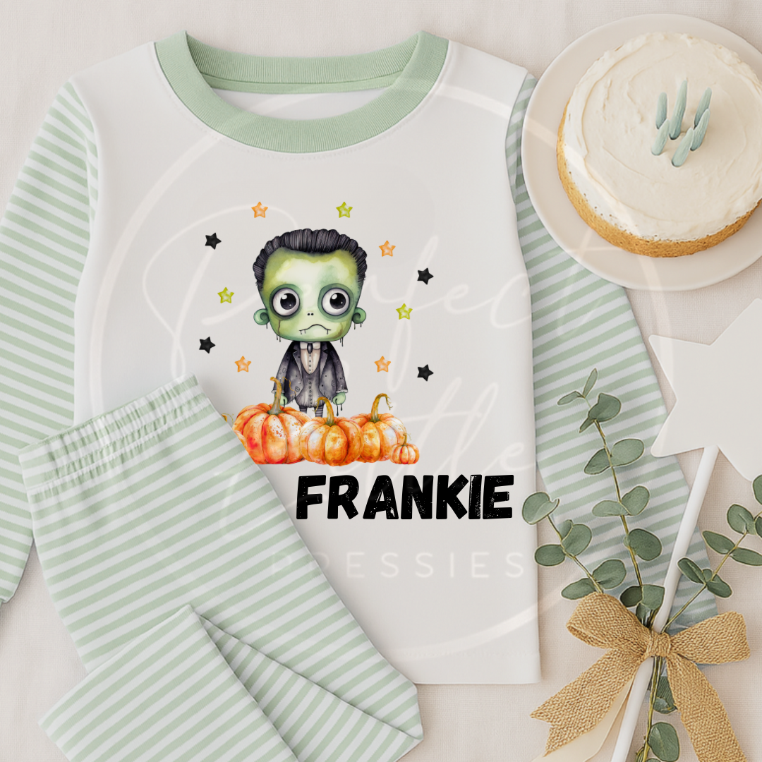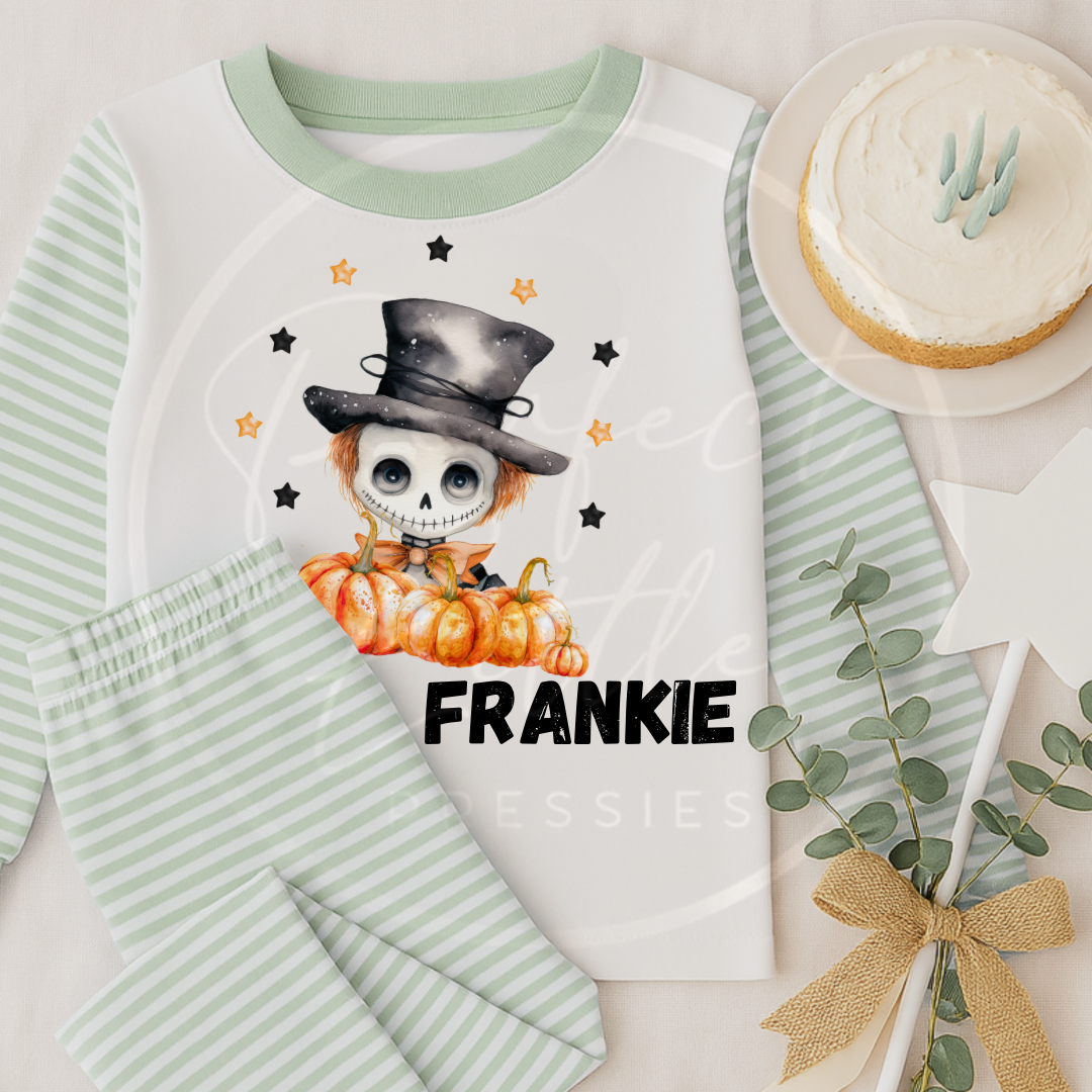 Get cosy with a spooky twist in our Personalised Sage Pyjamas! Featuring a choice of fun Halloween characters – a cheeky skeleton, a fang-tastic vampire, or a playful green zombie – these PJs are perfect for adding fright-night charm to your bedtime style.
