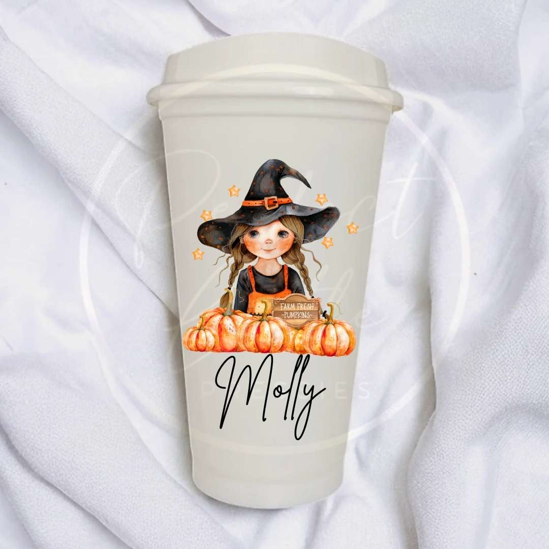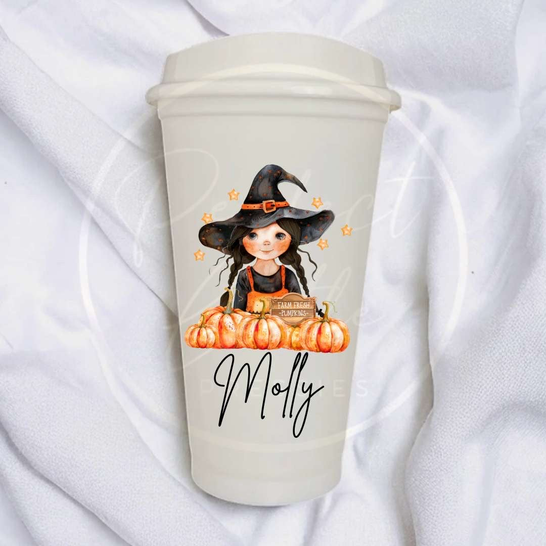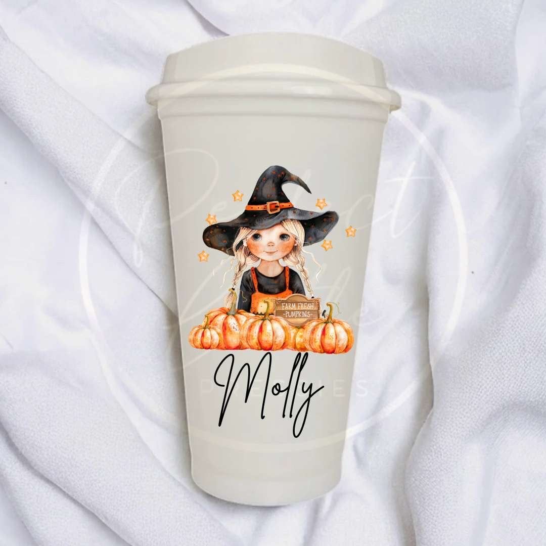 The crisp white background beautifully highlights the playful witch dolly artwork, complete with a pointy hat, striped stockings, and spooky-cute details. Whether youâre running errands, heading to a Halloween party, or just embracing autumn coziness, this cup adds a fun and festive flair to your day.