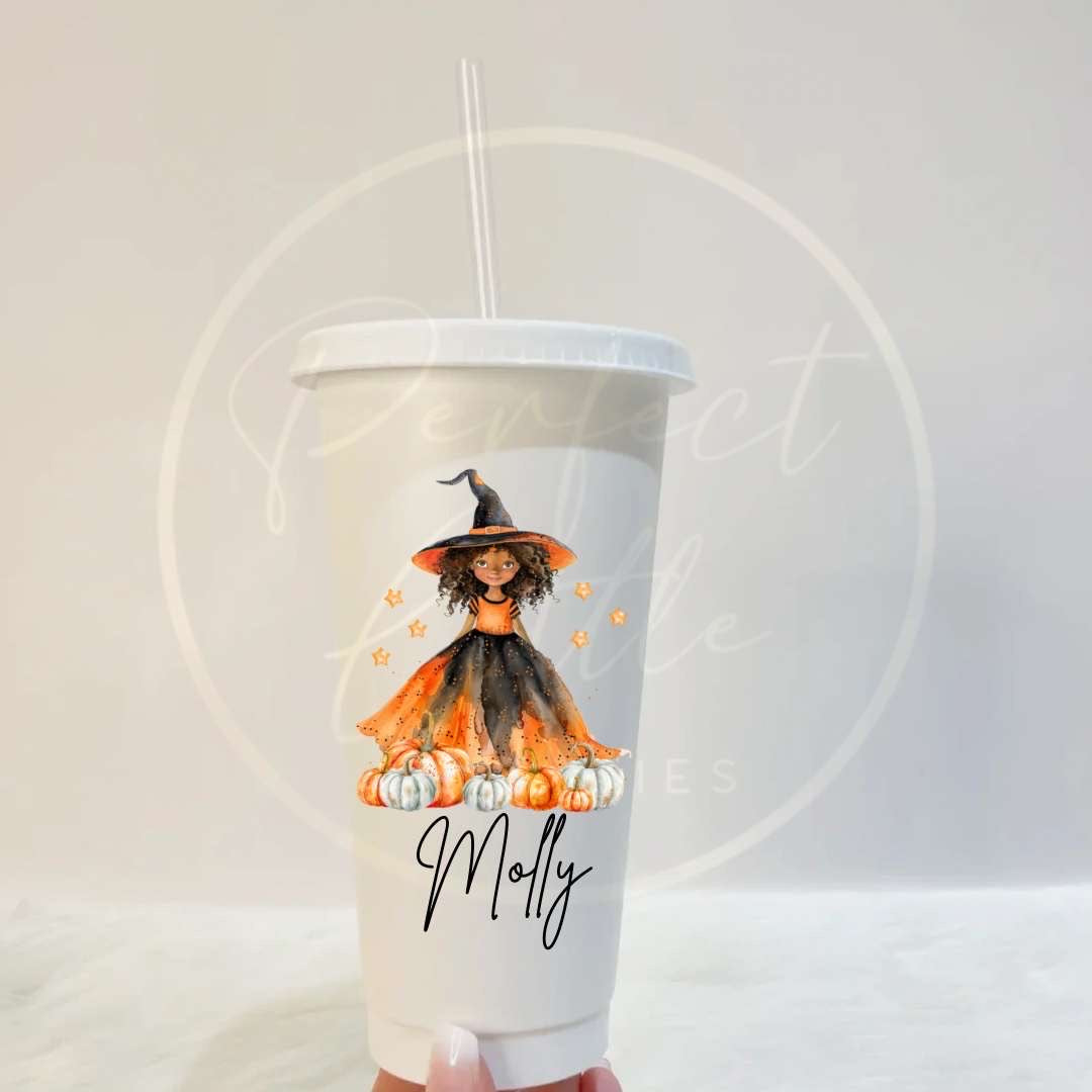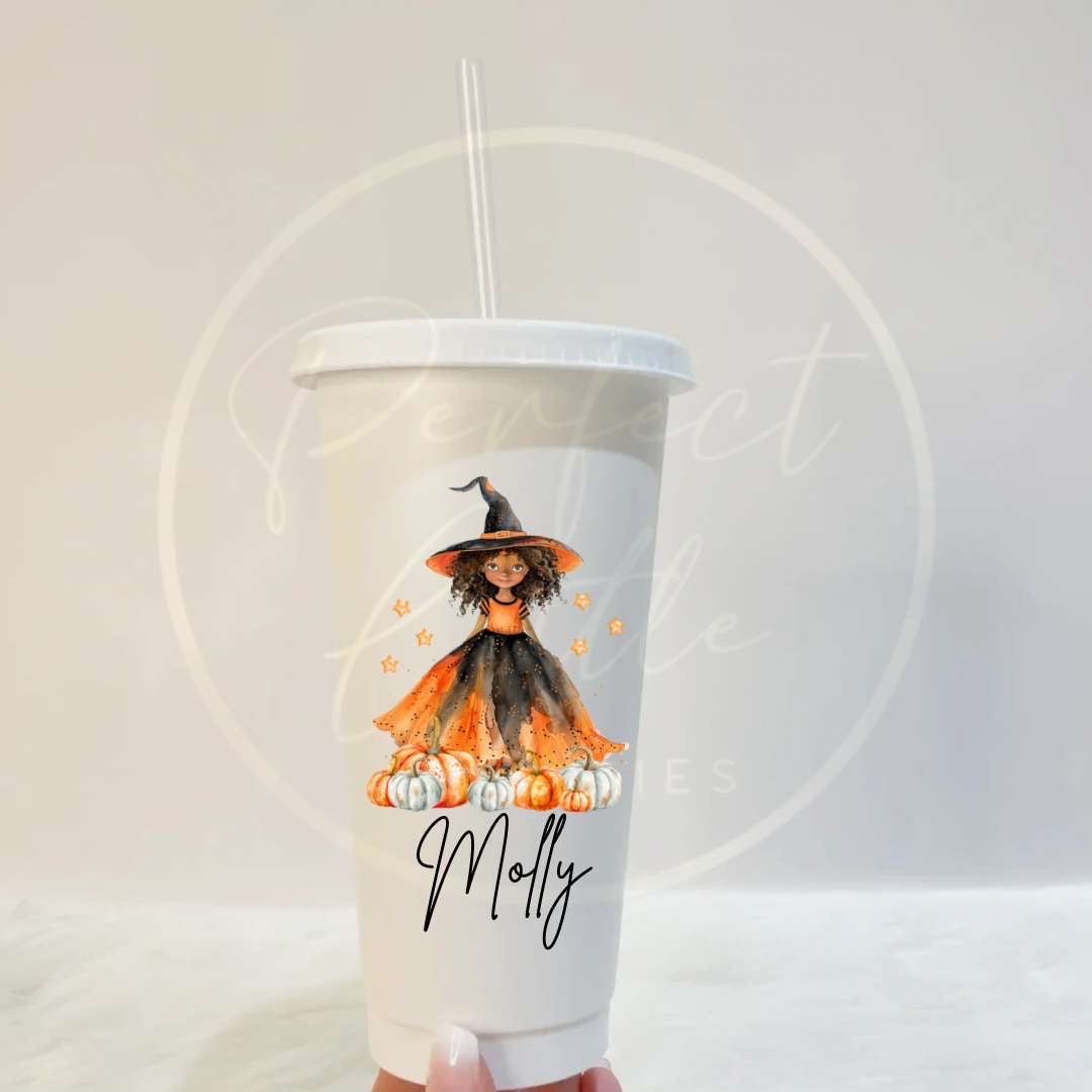 Sip in spooky style with this adorable Halloween Dolly Witch Cold Cup! Perfect for your iced coffee, spooky mocktails, or witchy brews, this 24oz reusable cup features a cute dolly-style witch dressed for fright night – complete with a pointy hat, striped stockings, and a touch of glittery magic.