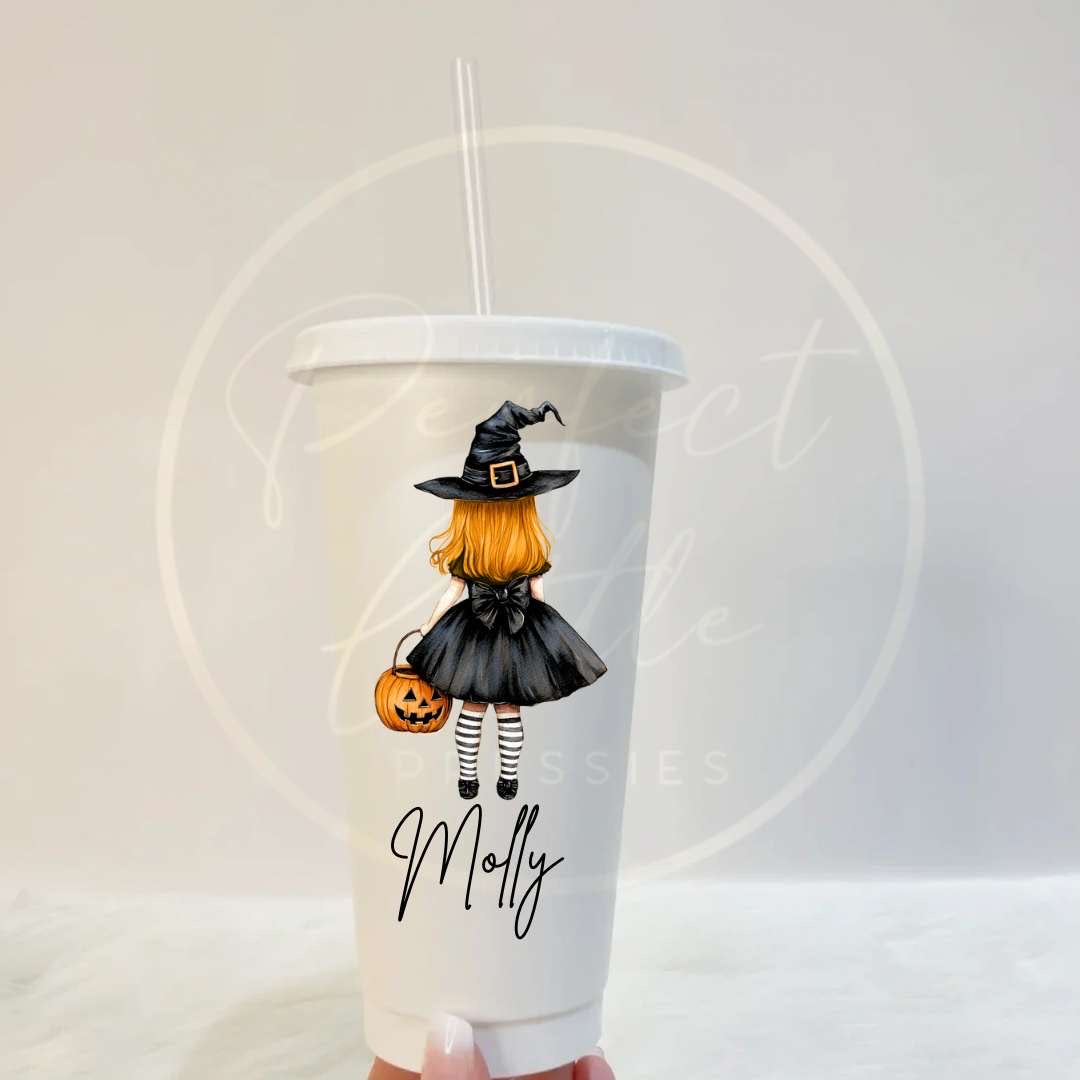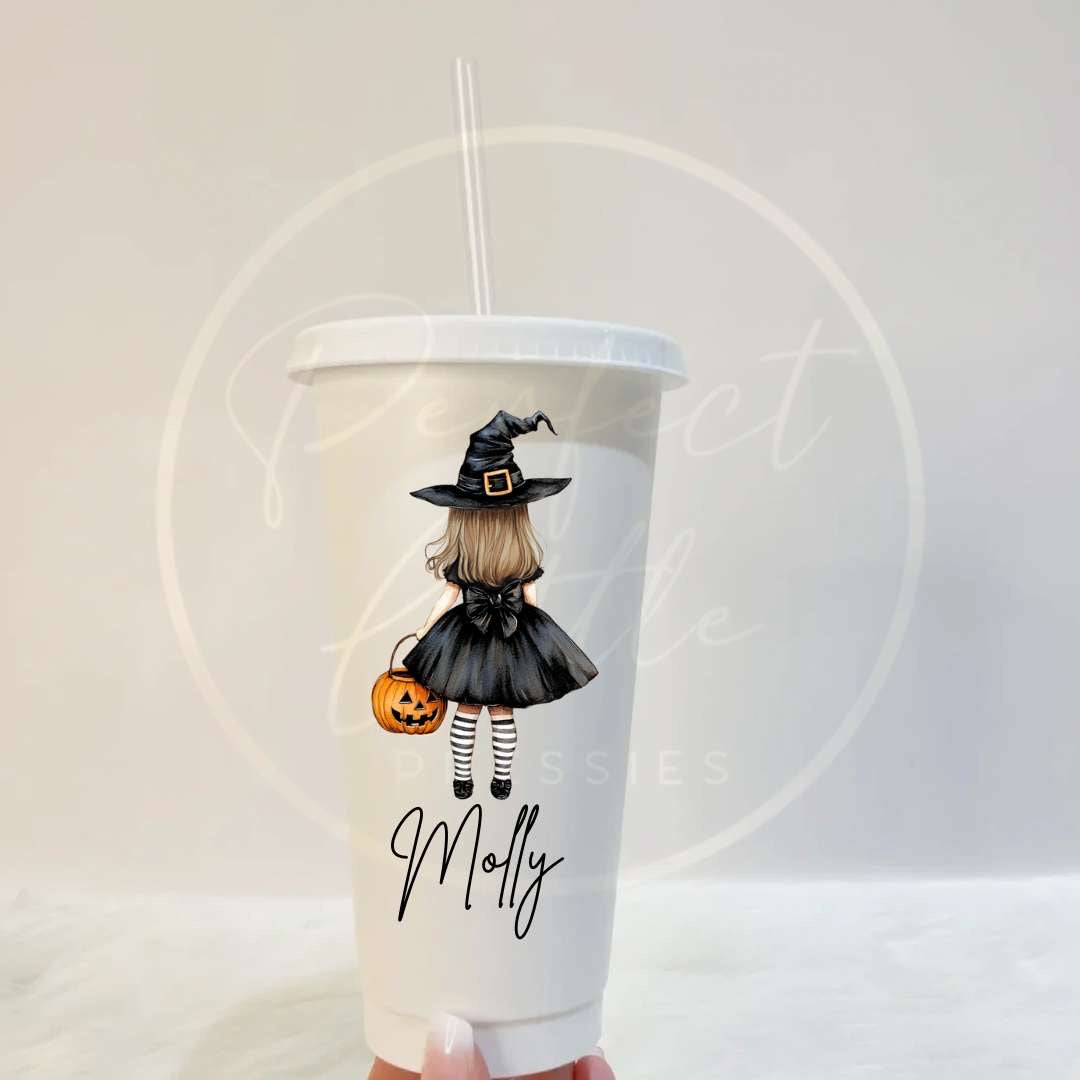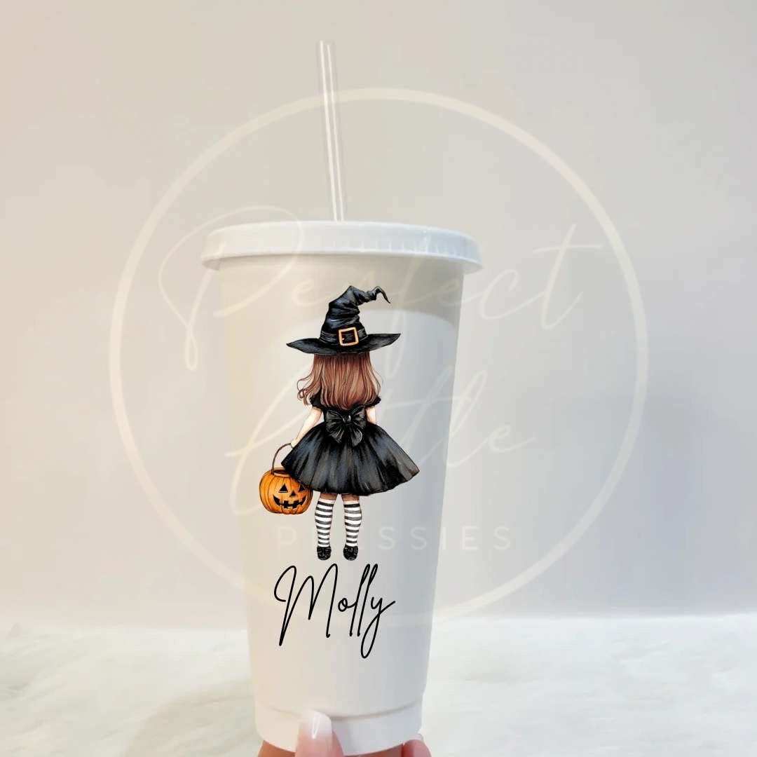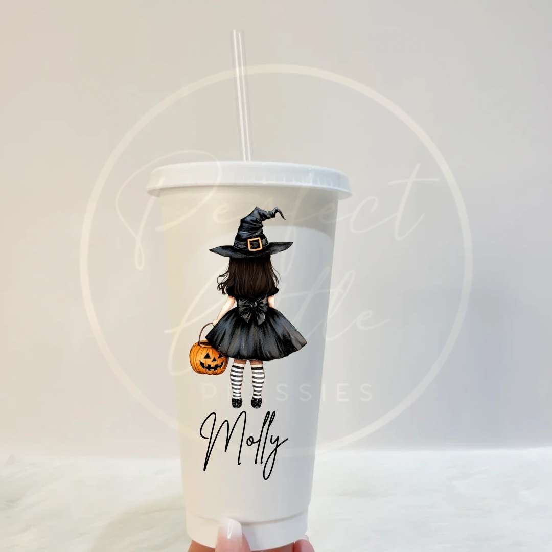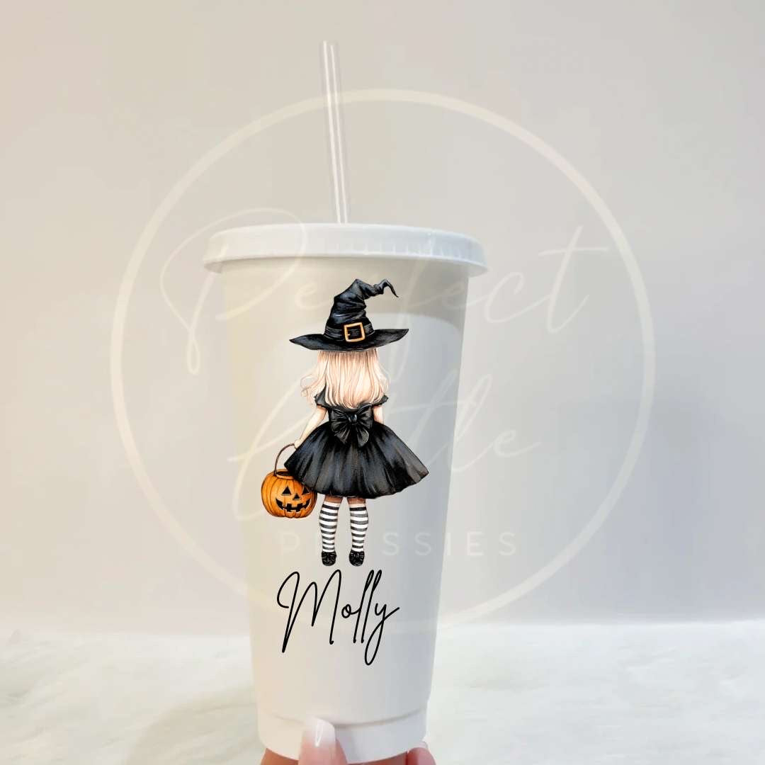 Sip in spooky style with this adorable Halloween Dolly Witch Cold Cup! Perfect for your iced coffee, spooky mocktails, or witchy brews, this 24oz reusable cup features a cute dolly-style witch dressed for fright night – complete with a pointy hat, striped stockings, and a touch of glittery magic.