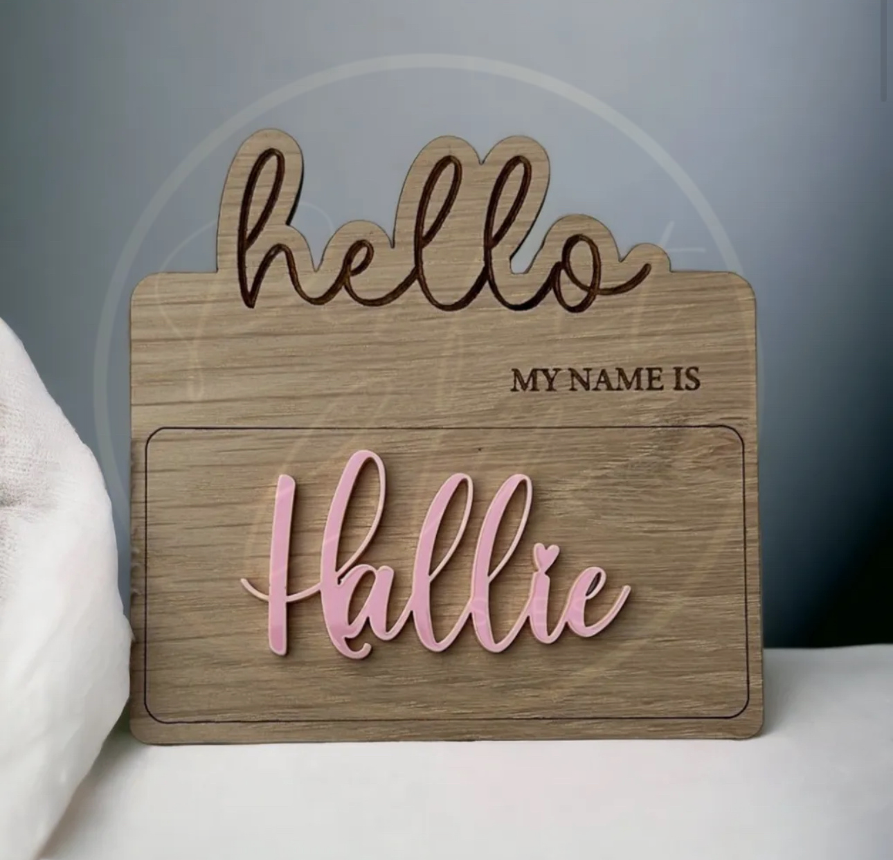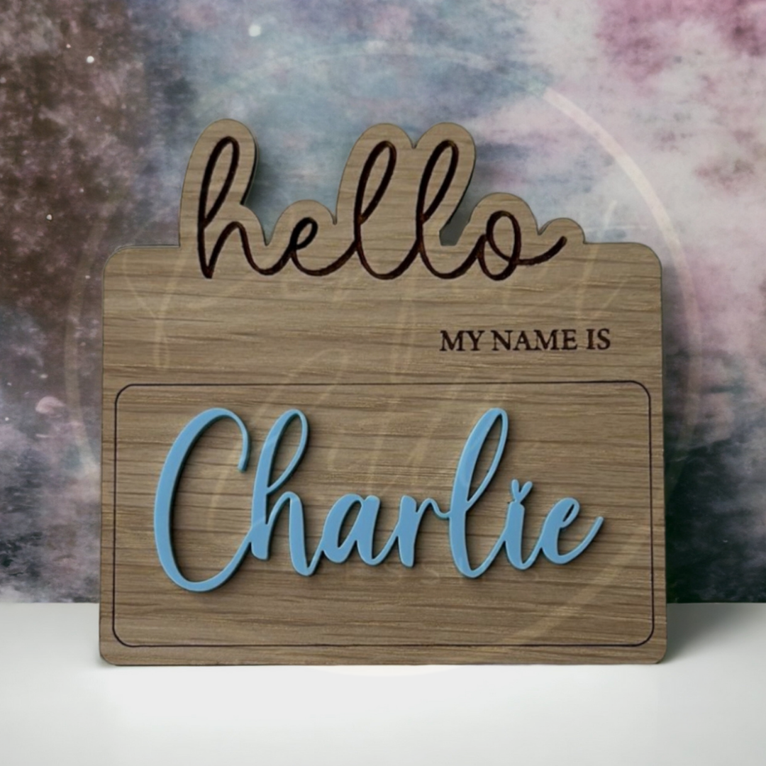 Expertly engraved with the phrase "Hello my name is" followed by your chosen name, this plaque makes a thoughtful keepsake for birth announcements, baby showers, or nursery decor. Simple, sweet, and full of charm—it’s a beautiful way to celebrate the beginning of a brand new chapter!