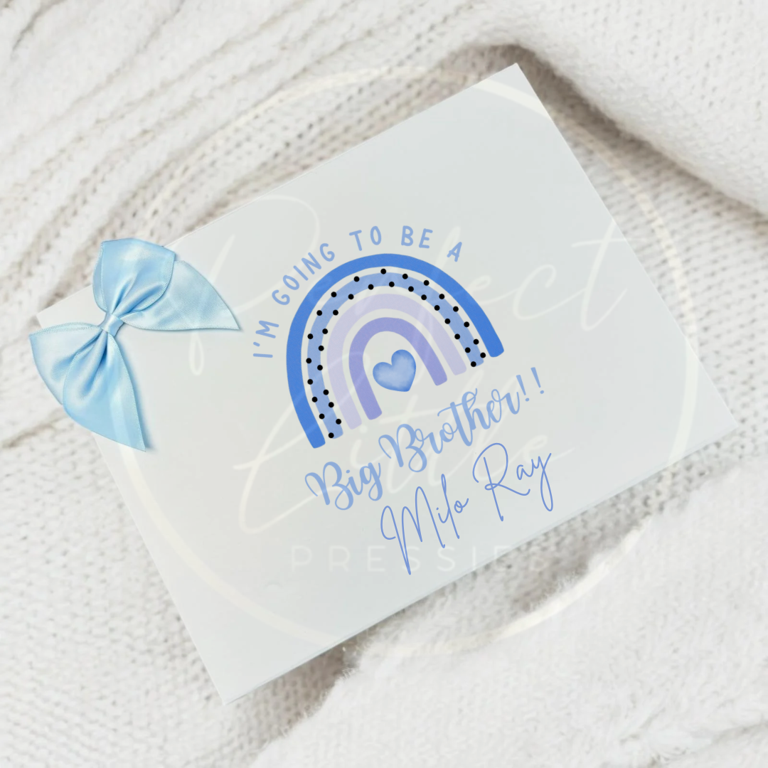 Make your exciting news extra special with this charming personalised announcement box, featuring a soft blue rainbow design and the heartfelt phrase “I am going to be a...” — the perfect way to reveal your wonderful news to family and friends.