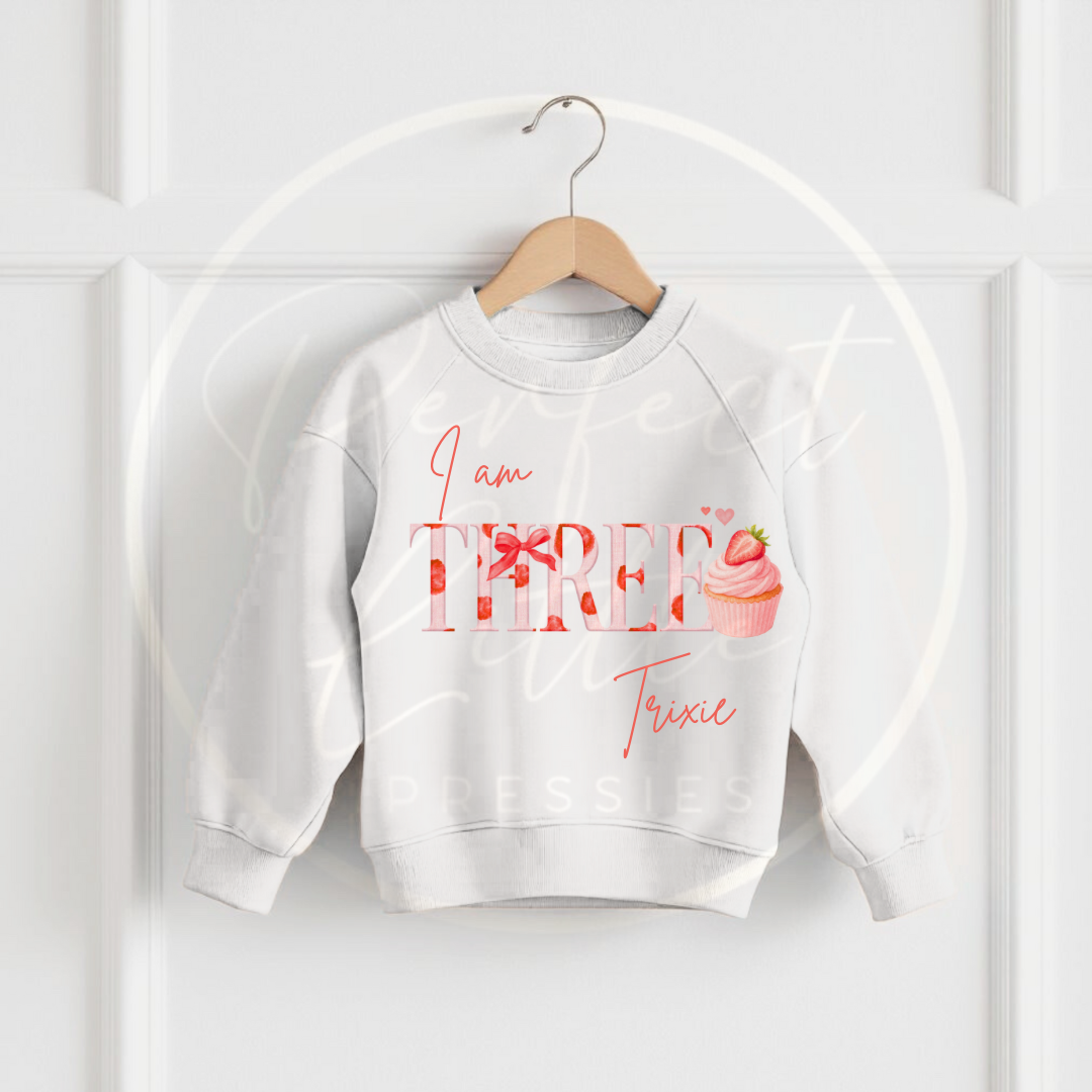 Personalised White Kids' Birthday Sweatshirt with Strawberry Design – Sweet, Festive & Made Just for Them
