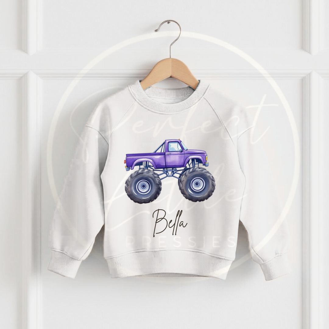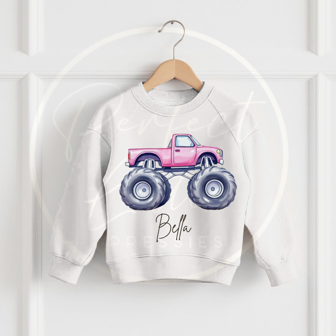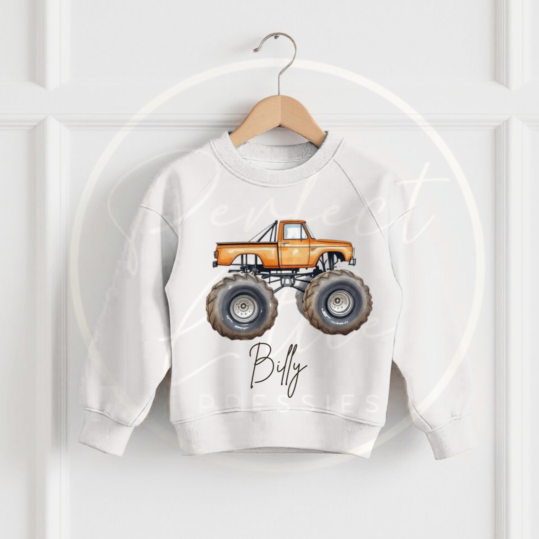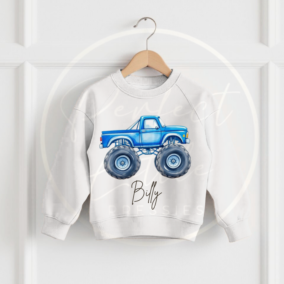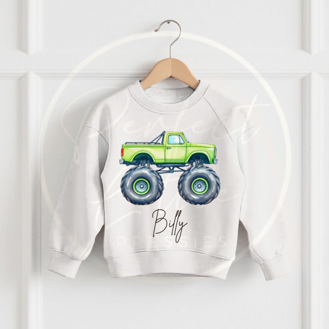 Personalised White Kids' Sweatshirt with Monster Truck Design – Bold, Fun & Made Just for Them