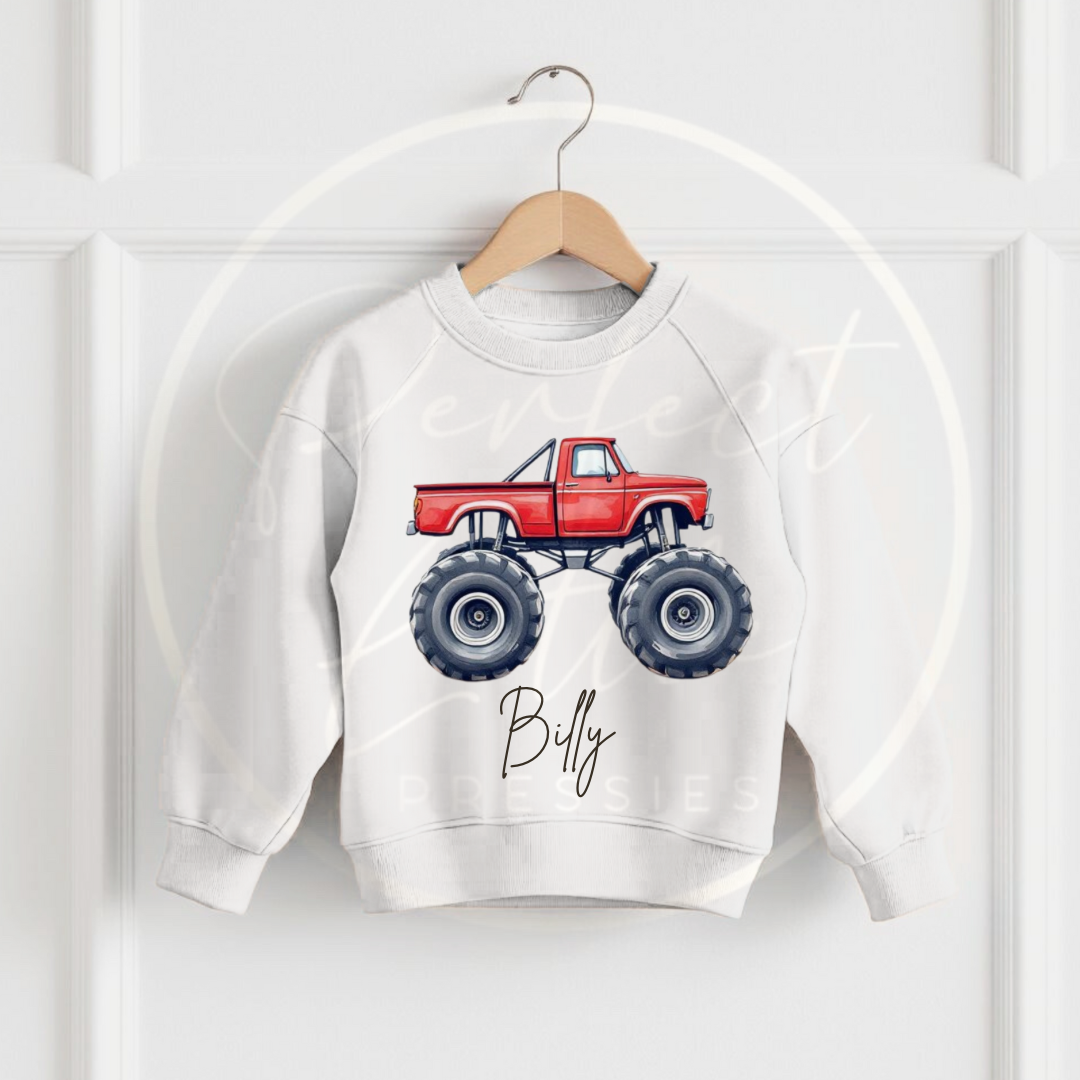 Classic white sweatshirt with a striking, personalised monster truck graphic