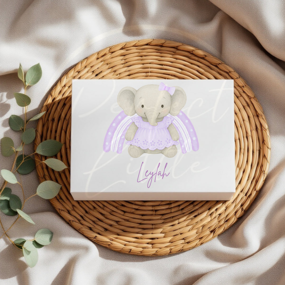 With calming lilac tones and a sweet elephant beneath a delicate rainbow, this keepsake box is ideal for storing treasured items such as hospital bracelets, first curls, tiny outfits, and early mementoes. Personalised with your chosen name, date or short message, it becomes a truly meaningful gift to be cherished for years to come.