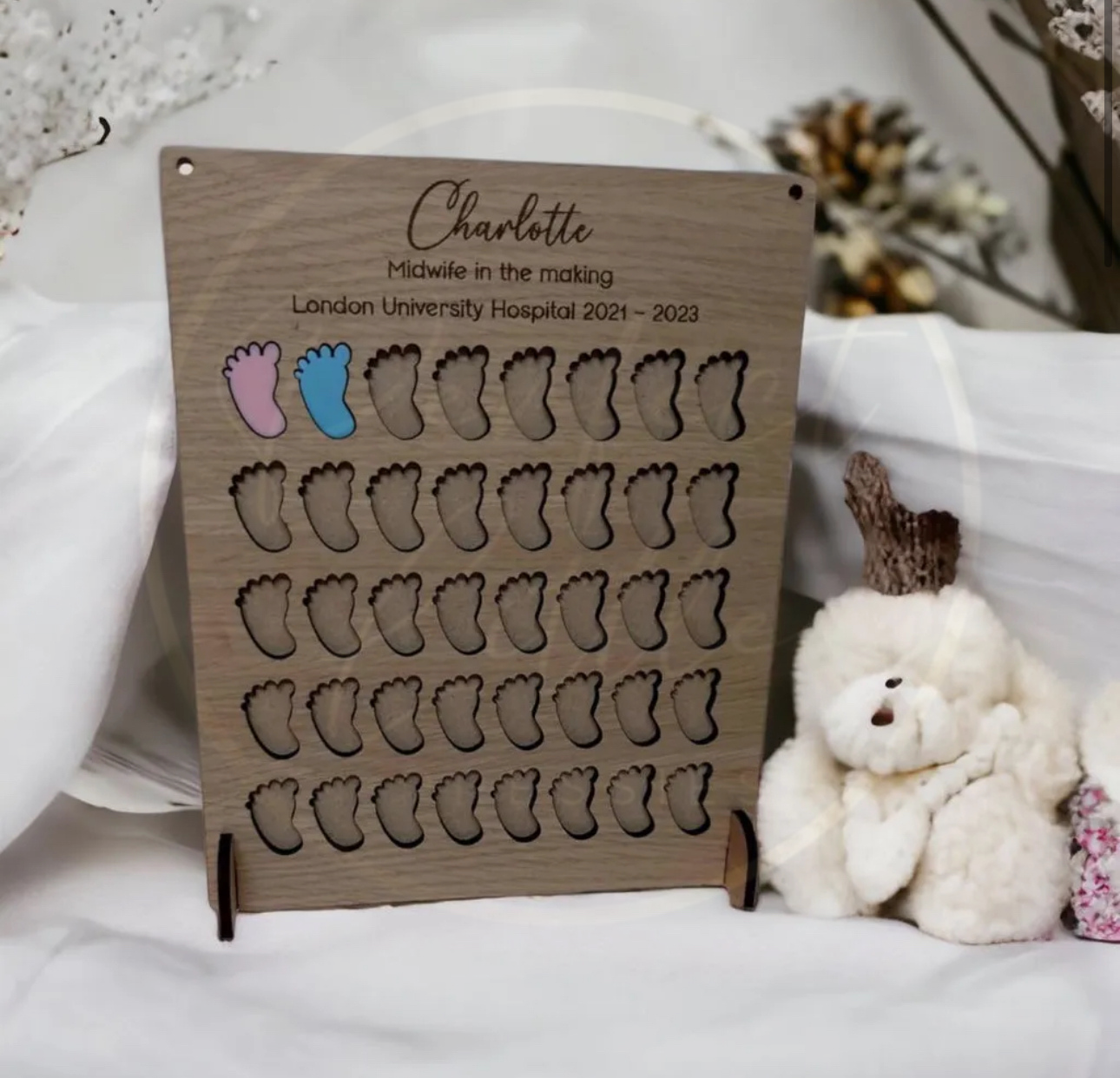 Made from high-quality oak veneer, this sign is customised with the midwife’s name and includes 30 blue baby feet and 30 pink baby feet to update the baby count with ease. It’s the perfect mix of practical and personal – ideal for displaying in a placement setting, study space, or home.