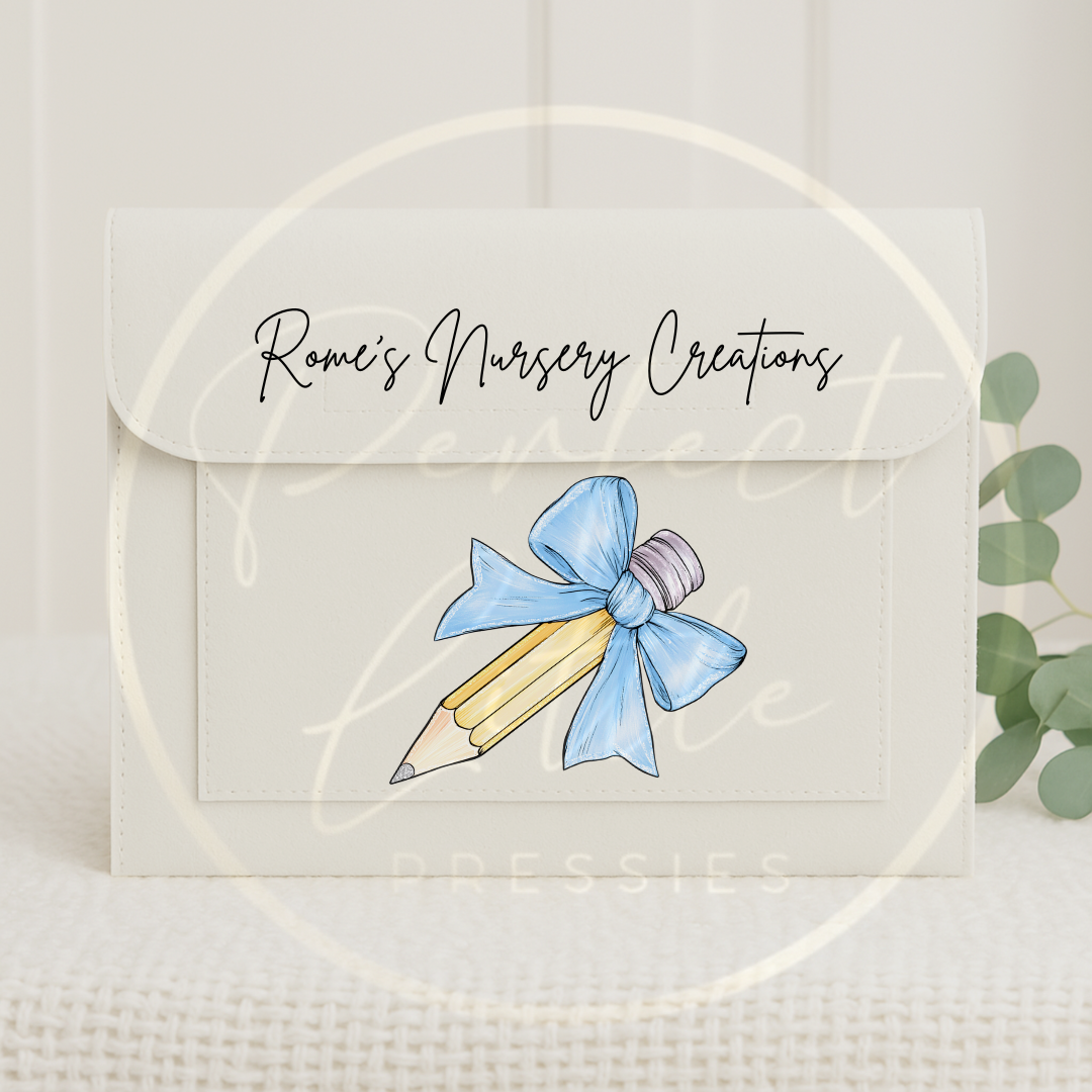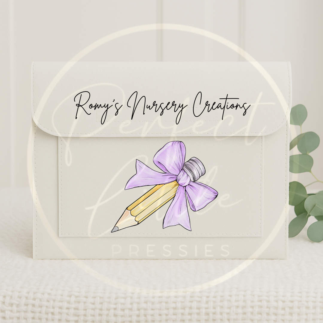 Keep your little one’s special memories and documents safe with our Felt Folder – Nursery Creations. Featuring a sweet bow pencil design with the wording “Nursery Creations”, this folder is perfect for storing drawings, crafts, certificates, and keepsakes from their nursery days.