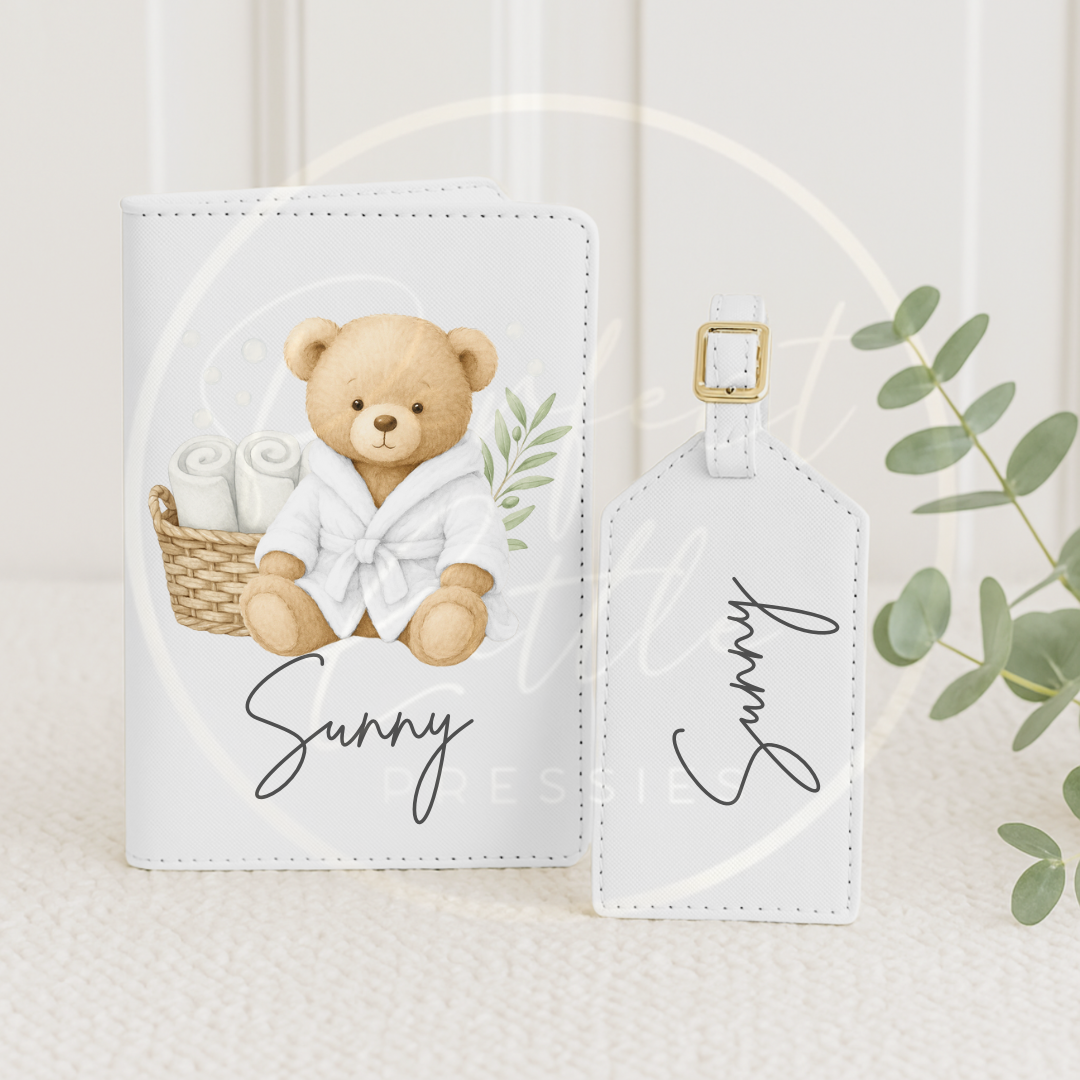 Personalised Passport Cover & Luggage Tag Set with Bear in Robe Design – Cosy, Cute & Perfect for Little Travellers