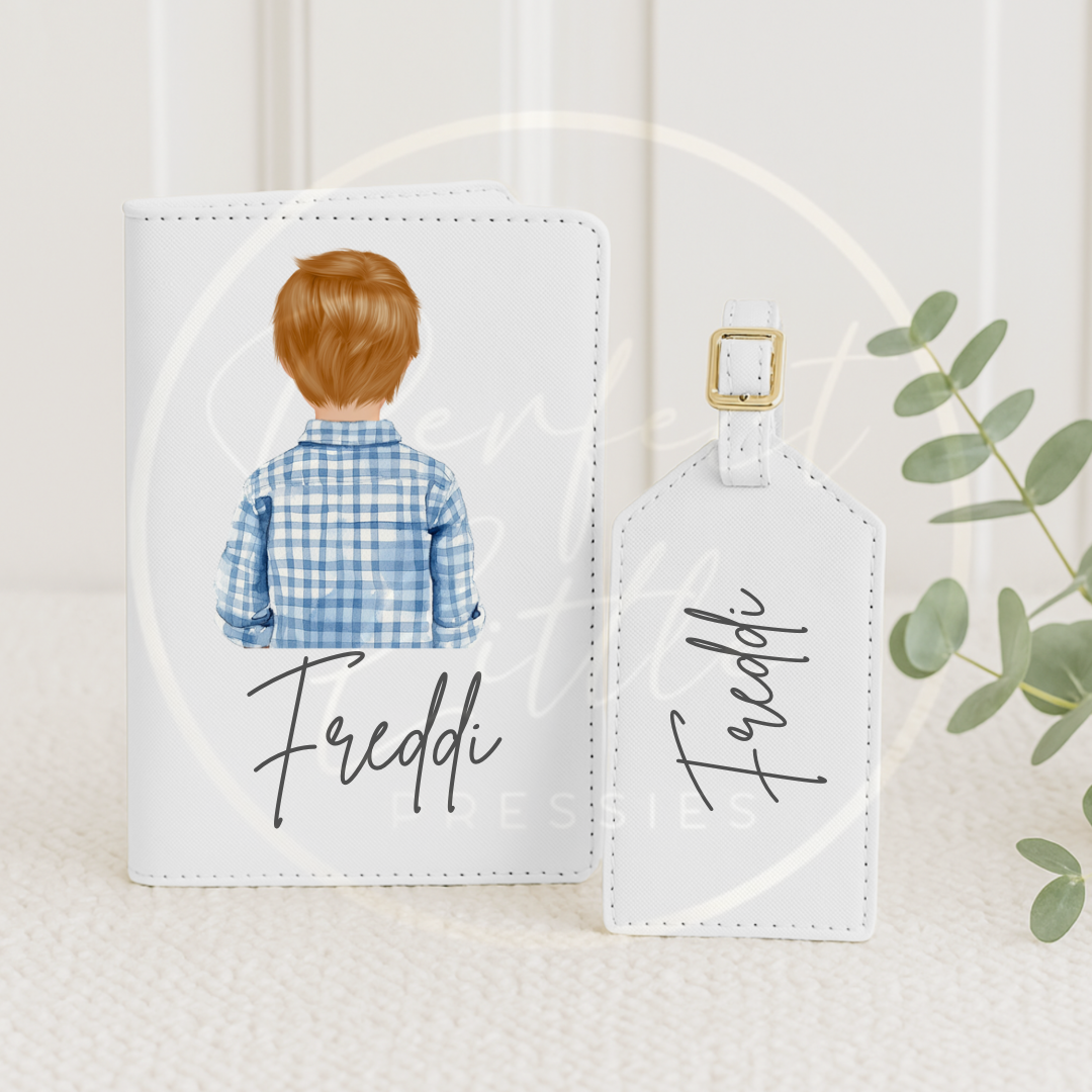 Personalised Little Boy in Blue Gingham Shirt Passport Cover & Luggage Tag Set