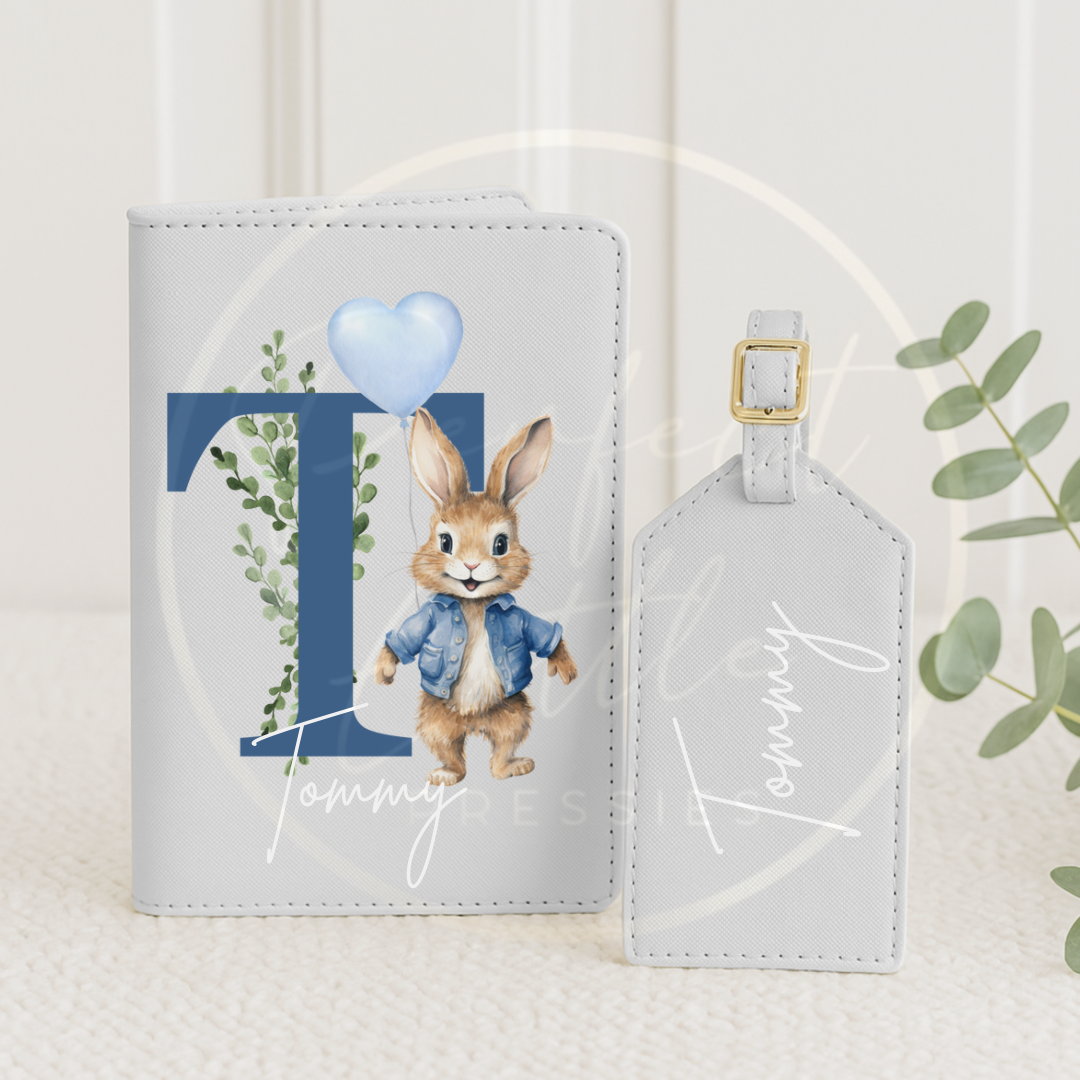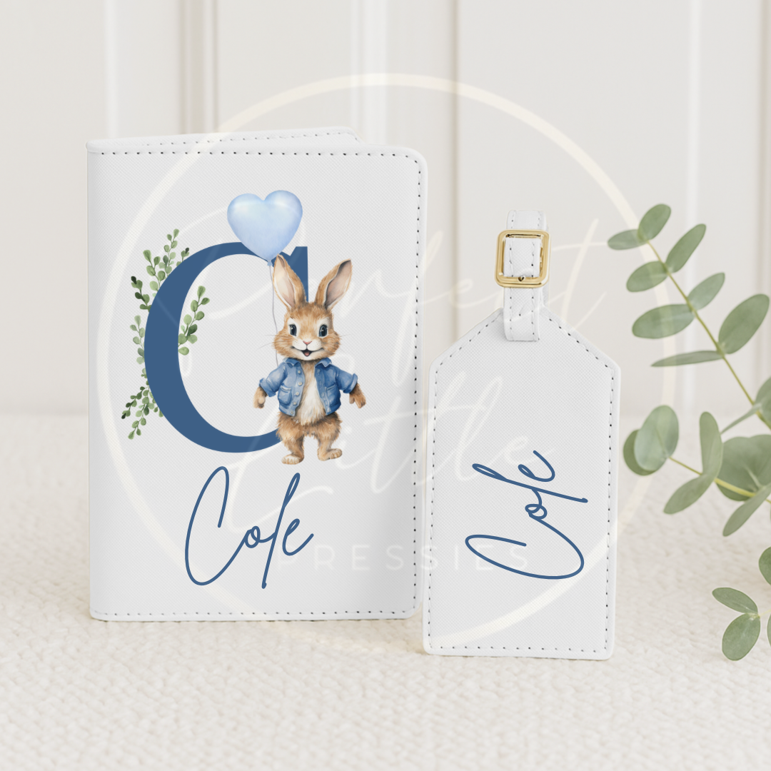 Passport Cover and Luggage Tag Set - Blue Initial Bunny Design