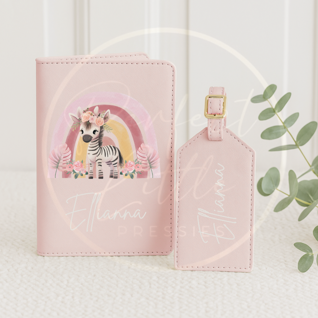 Personalised Passport Cover & Luggage Tag Set with Zebra Rainbow Design – Fun, Colourful & Perfect for Little Explorers