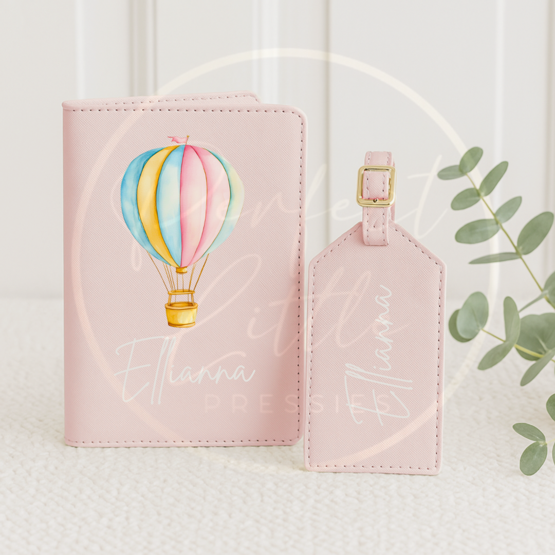 Personalised Passport Cover & Luggage Tag Set with Pastel Hot Air Balloon Design – Dreamy, Sweet & Perfect for Little Travellers