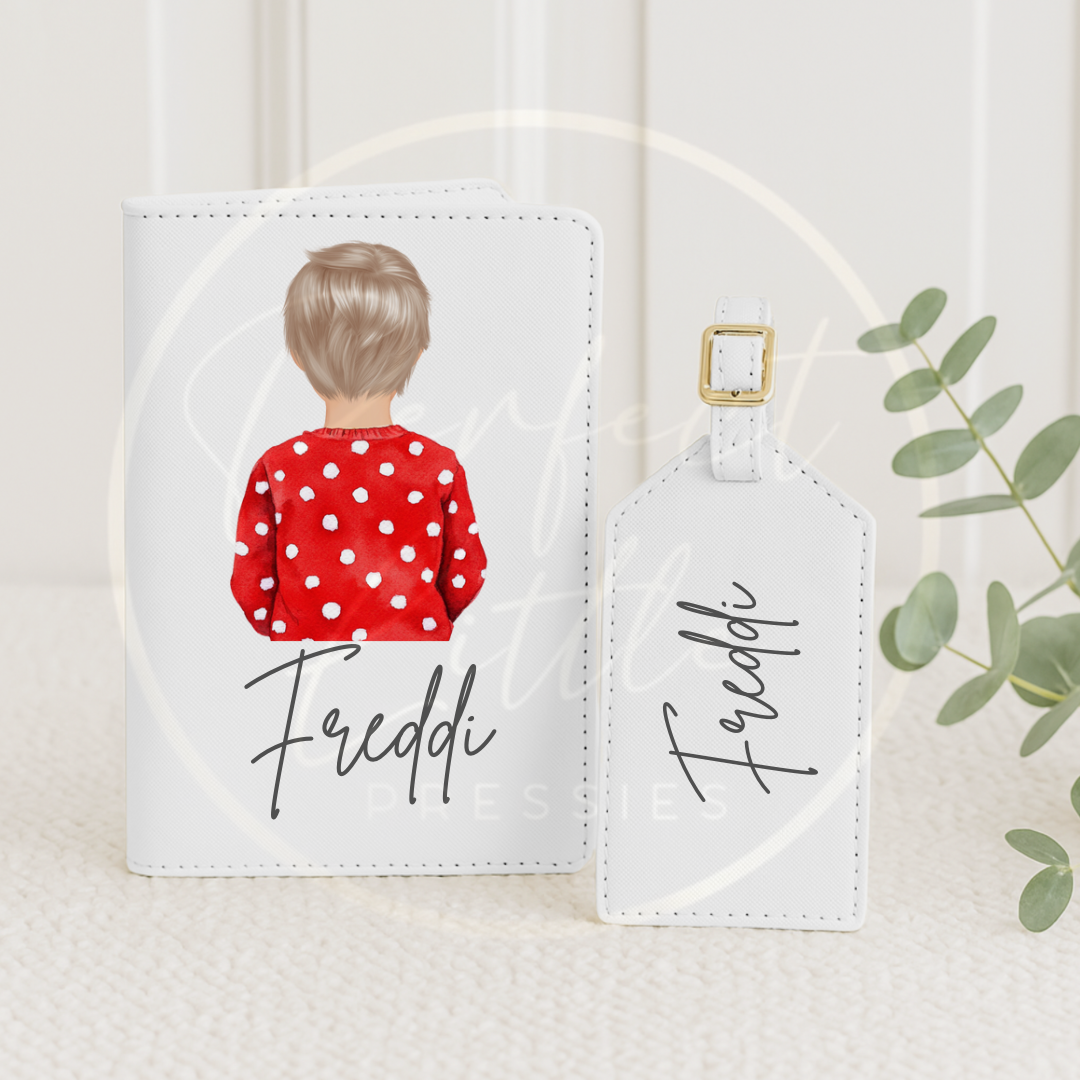 Personalised Little Boy in Polka Dot Jumper Passport Cover & Luggage Tag Set