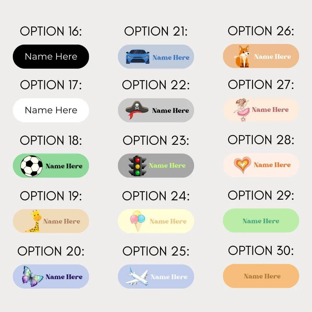 Keep your child’s belongings clearly marked and full of fun with our personalised name labels, featuring their name and a design of your choice from 30 unique options! Whether you're labelling clothes, lunchboxes, water bottles, or school supplies, these durable labels come in iron-on for fabrics or adhesive for hard surfaces.