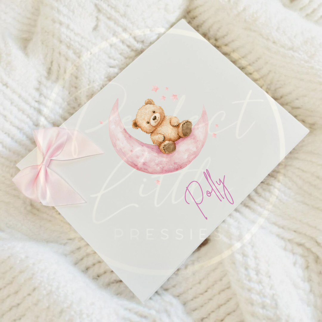 Celebrate your little one’s magical moments with this enchanting personalised keepsake box, featuring a charming pink moon bear design – perfect for dreamy nurseries and treasured memories.