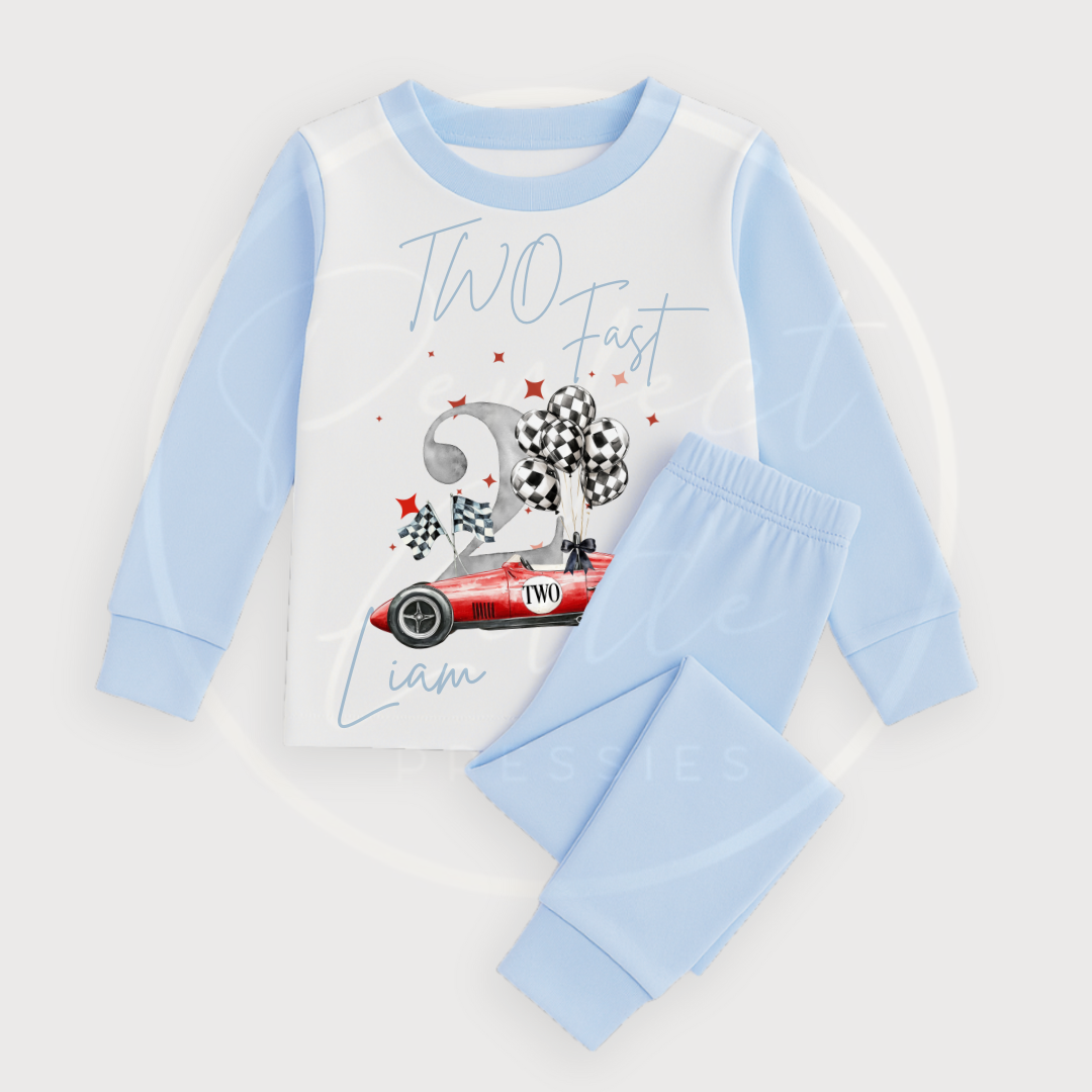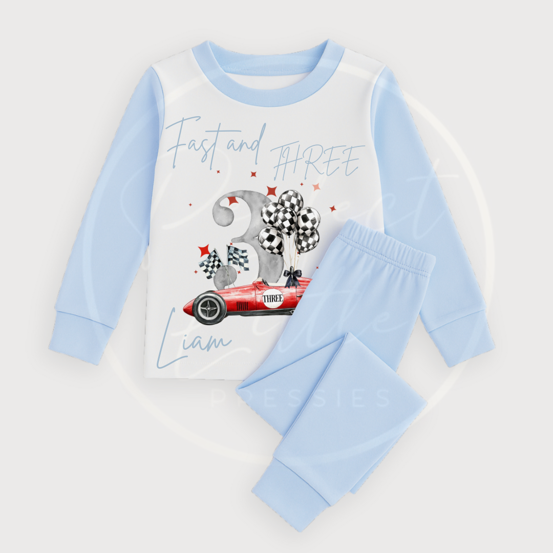 Start your engines and get ready to celebrate with these fast and fun race car-themed birthday pyjamas! Featuring a vibrant design with speedy cars, chequered flags, and your child’s name and age, these personalised pyjamas are perfect for making birthday mornings even more exciting.