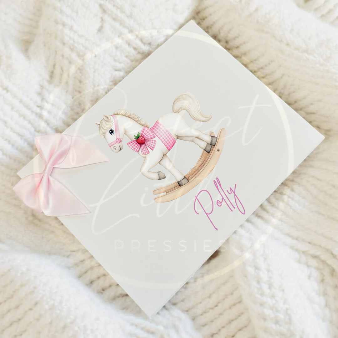 With its soft pastel tones and playful illustration of a rocking horse adorned with strawberry details, this box is ideal for storing precious mementoes such as first curls, hospital bracelets, tiny outfits, and treasured keepsakes. Personalised with your chosen name, date or short message, it becomes a unique and heartfelt gift to cherish for years to come.